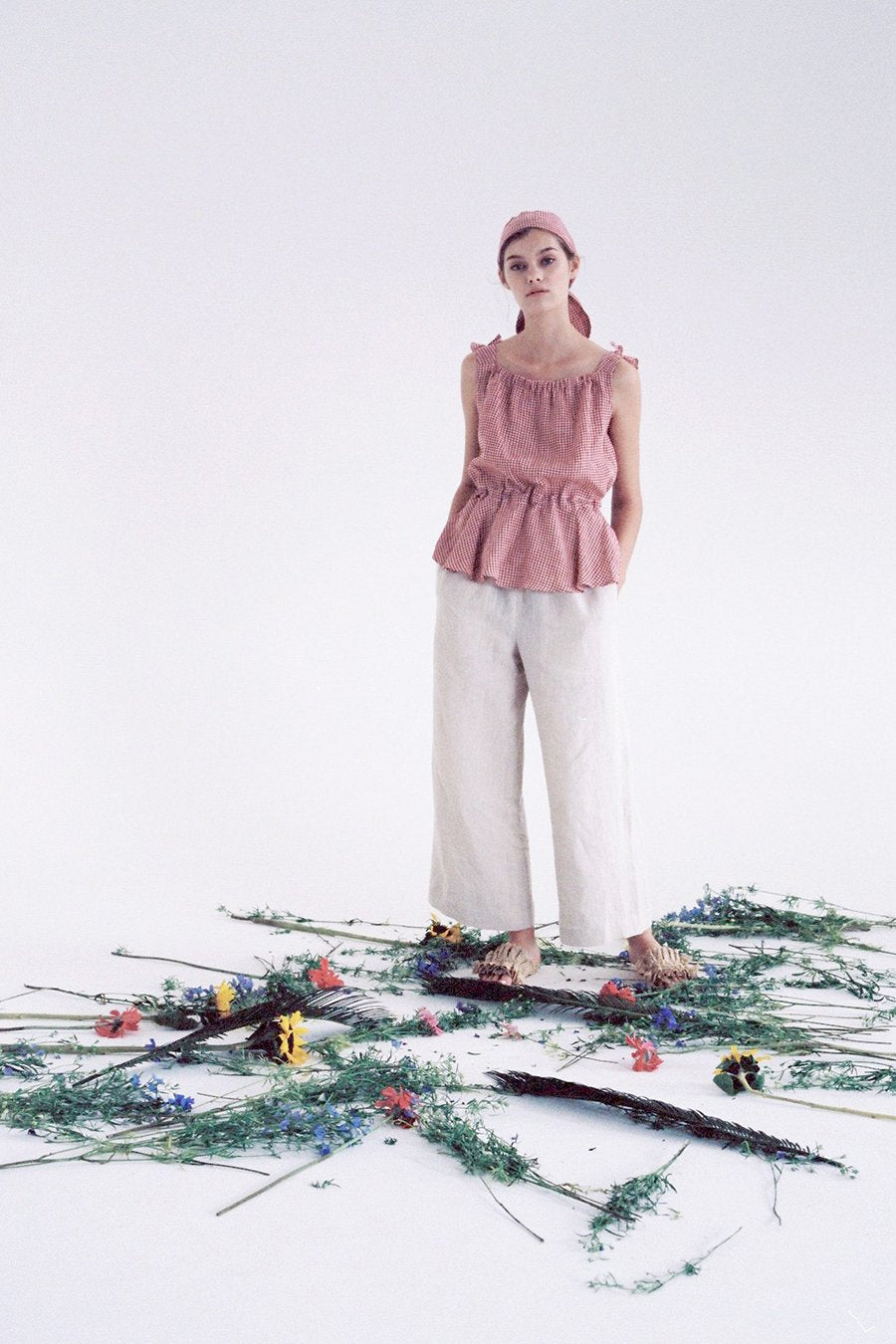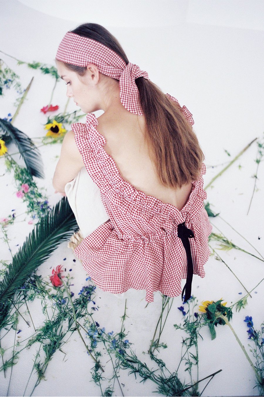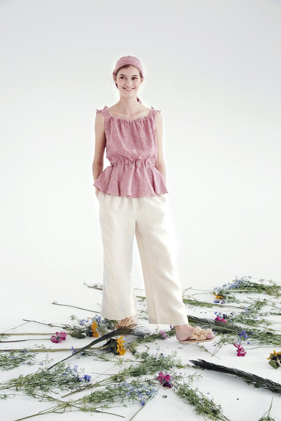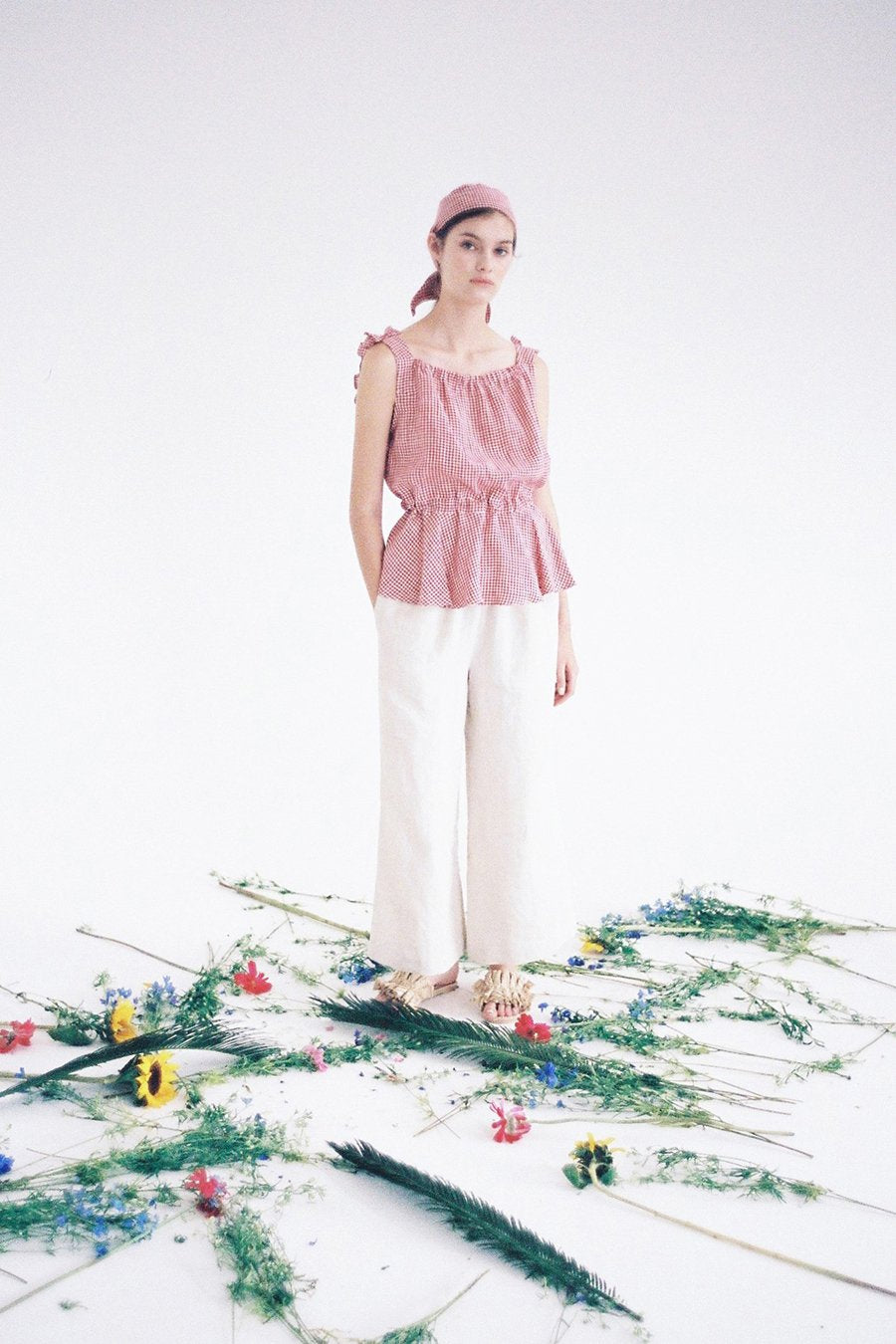 The Laura Ren gingham linen blouse captures summer femininity with a playful twist. Featuring an elasticated peplum waist and shoulder-tie straps, the top boasts a romantic silhouette with soft volume. The standout deep V-back design is finished with a delicate ruffle trim and ribbon tie detail, balancing charm with sensuality. Crafted in breathable linen, this piece is perfect for sunny escapes or al fresco weekends.