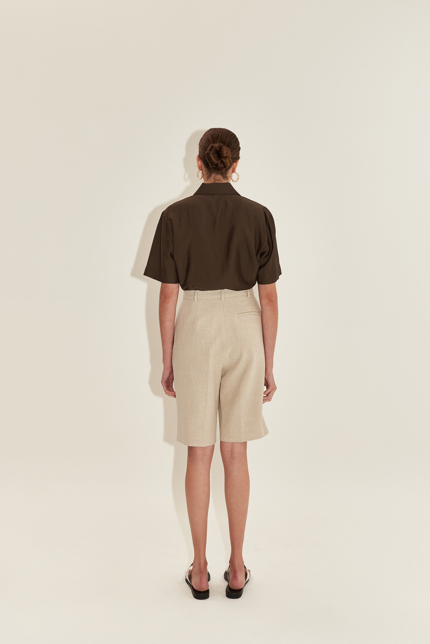 High-Waisted Linen Bermuda Shorts for Women with Tailored Fit and Knee-Length Silhouette