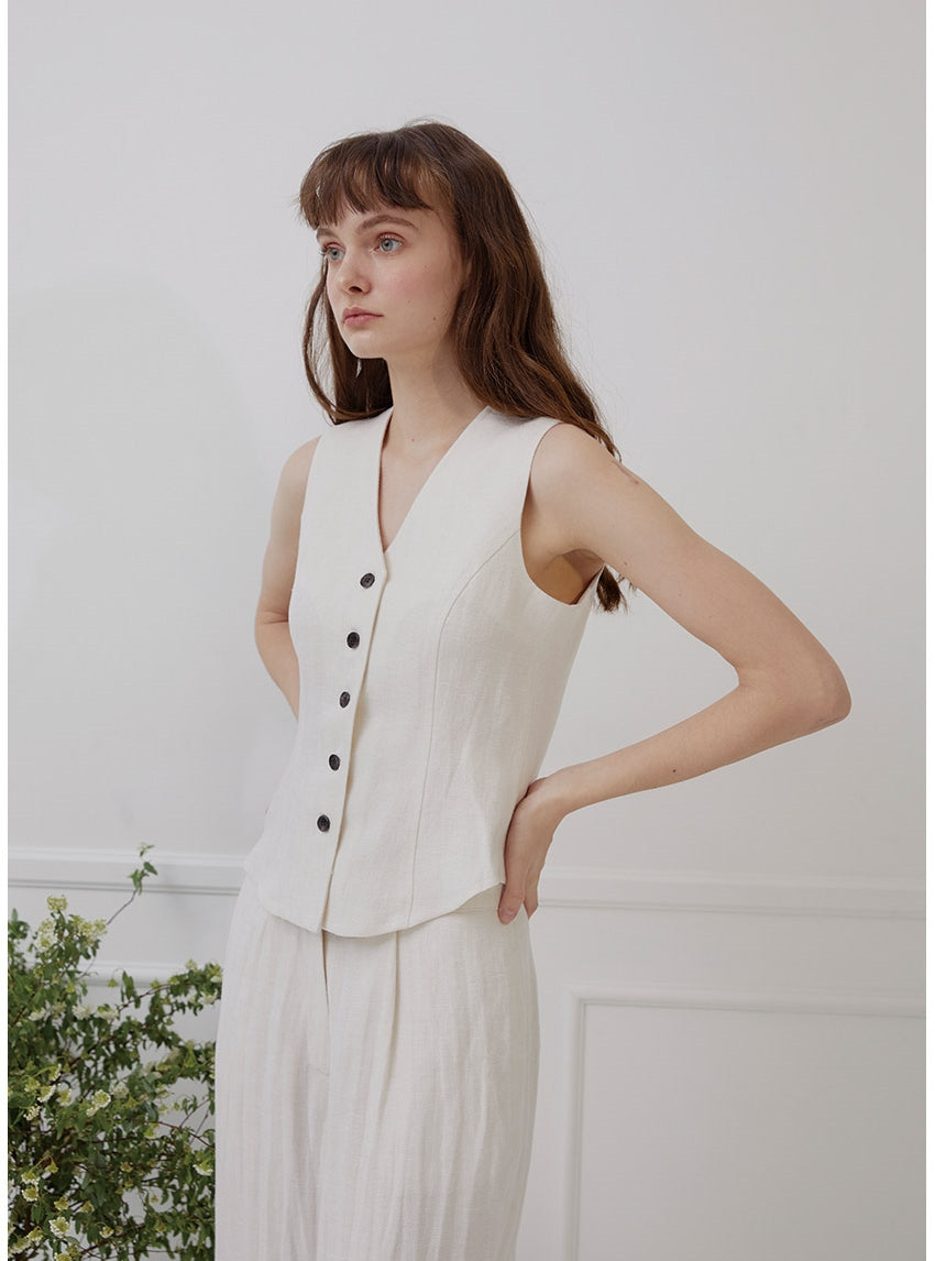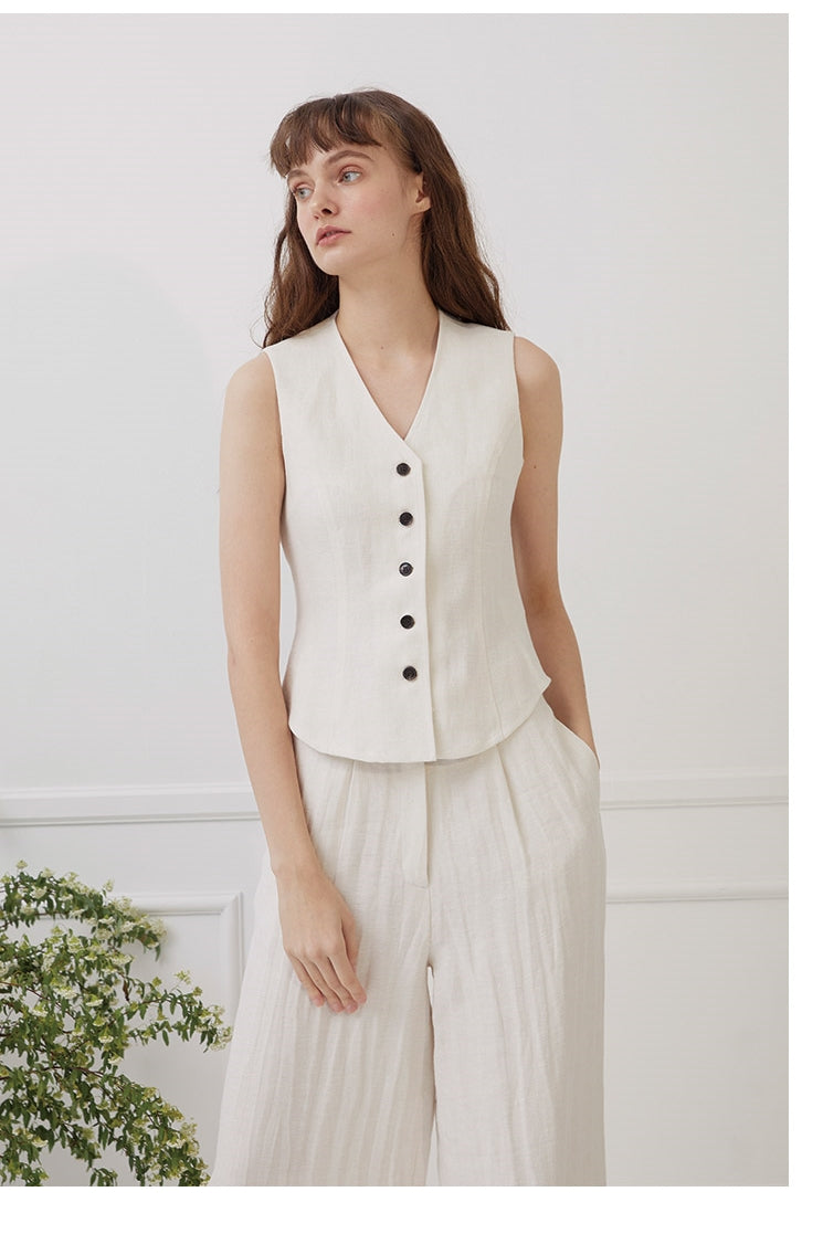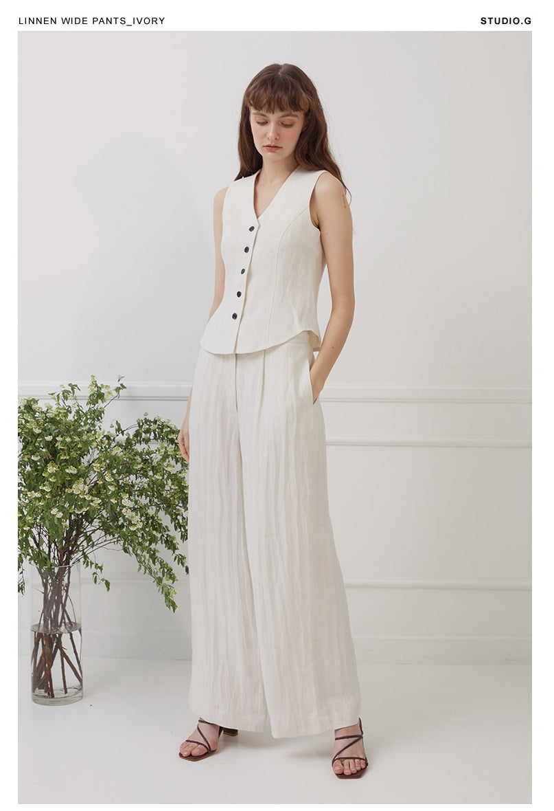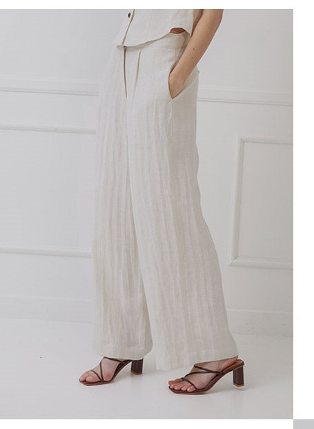 The Laura Ren high-waisted linen pants are a masterclass in minimalist refinement, crafted to deliver everyday ease with tailored sophistication. Designed with a flattering high rise and wide-leg silhouette, these pants are enhanced by soft front pleats and a gently structured waistband to elongate the frame. A concealed side zipper keeps the lines clean, while the flowing cut adds graceful movement to every step. The breathable linen makes them a summer staple, ideal for styling with the coordinating vest top or a fitted blouse. Whether worn for city strolls or sun-soaked escapes, Laura Ren’s linen pants combine understated elegance with elevated comfort.