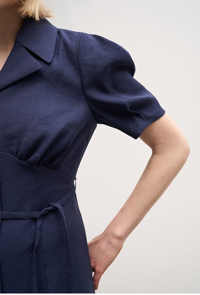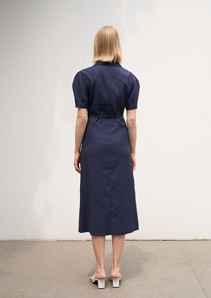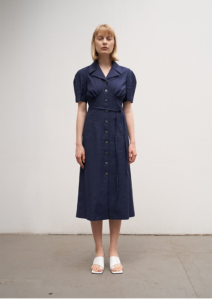 Elevate your everyday wardrobe with this effortlessly refined midi dress by Laura Ren, crafted from breathable, natural linen. The structured silhouette features a notched lapel collar, soft puff sleeves, and a classic button-down front, while the detachable waist tie accentuates your shape with ease. Designed for modern sophistication, the midi length adds graceful flow and coverage, making it perfect for both casual elegance and office-ready wear. This versatile piece captures timeless style with a minimalist twist, delivering comfort, femininity, and form in one beautifully tailored design.