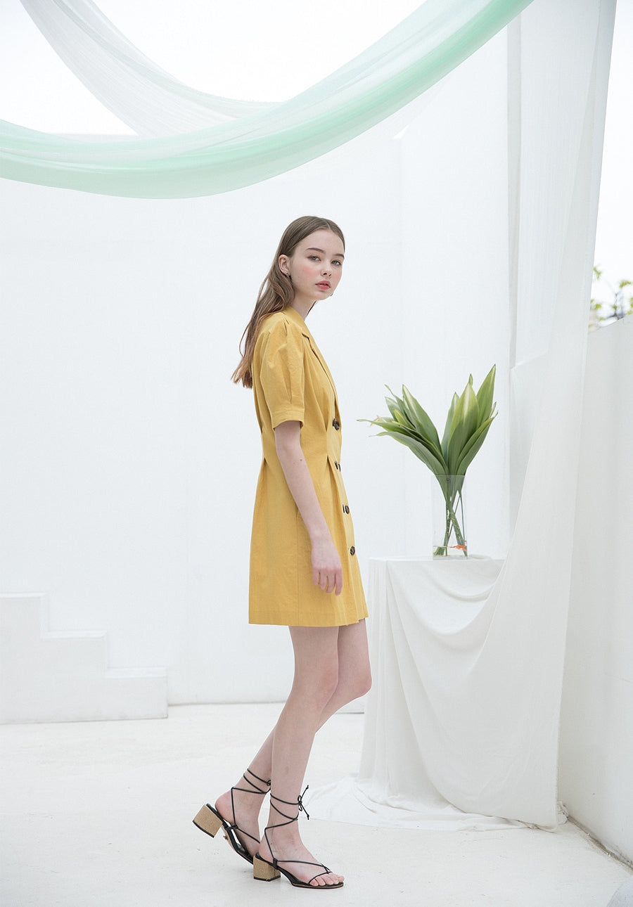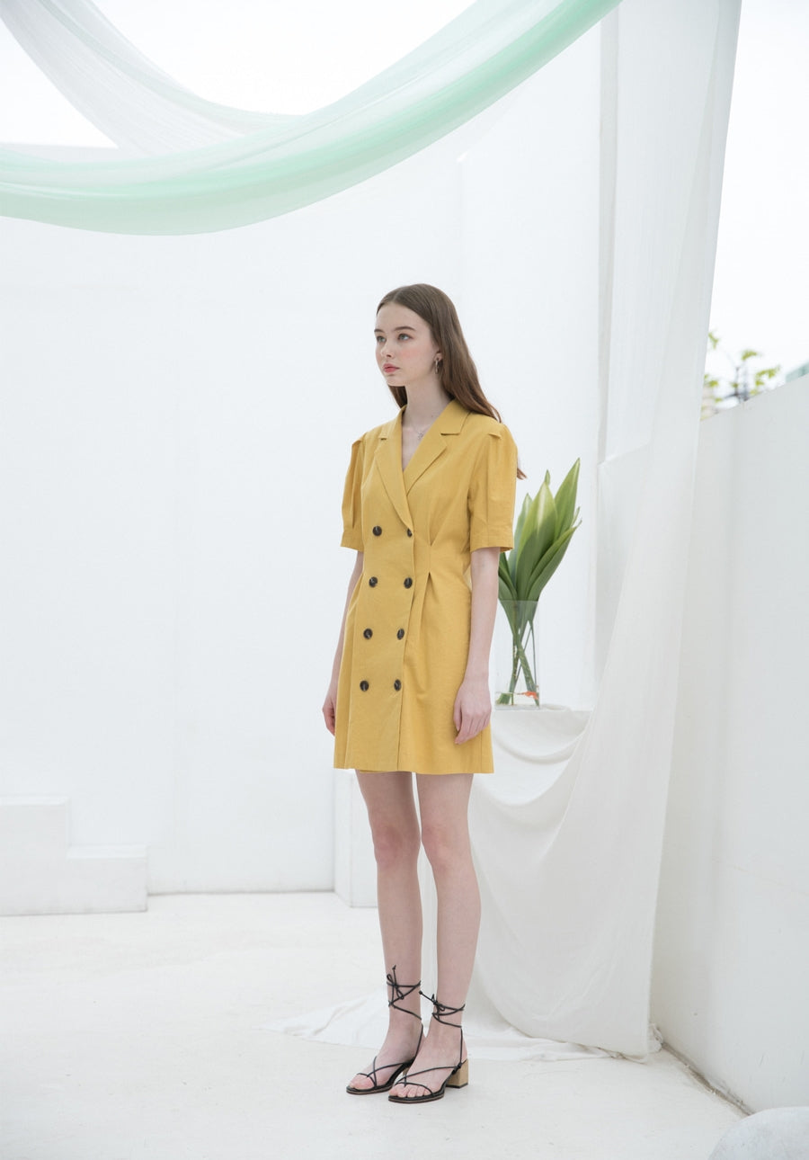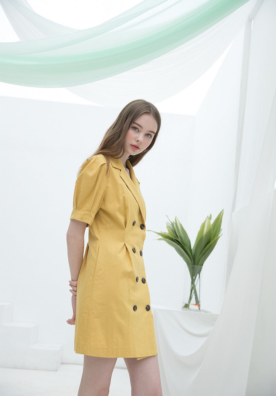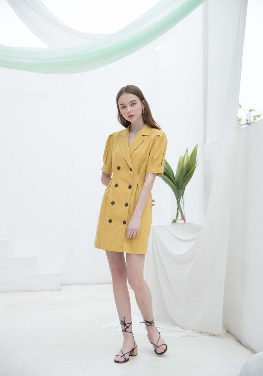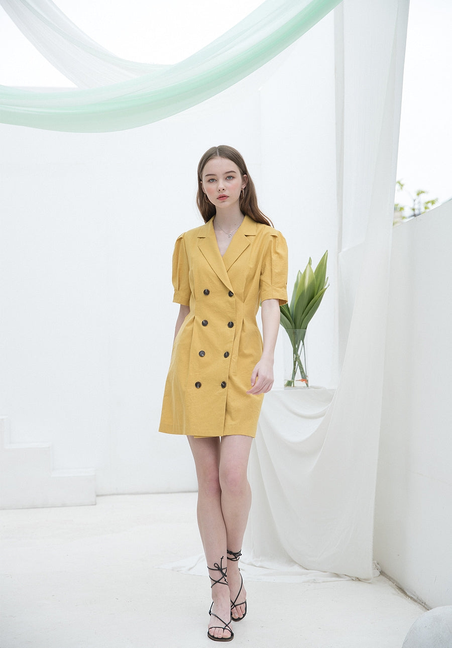 Elevate your summer wardrobe with this tailored linen mini dress from Laura Ren. Designed for the modern woman, it features a refined double-breasted front, structured puff sleeves, and a sleek notched lapel for a polished finish. The breathable linen fabric ensures comfort while the fitted silhouette flatters the figure, making it ideal for both work and casual outings. Laura Ren seamlessly blends classic tailoring with a contemporary mini cut to deliver a versatile statement piece that embodies quiet confidence and elegance. Pair it with sandals or heels to complete the look.