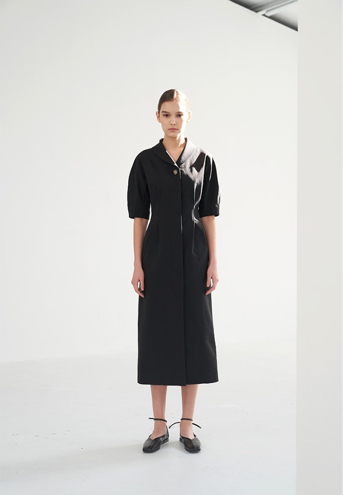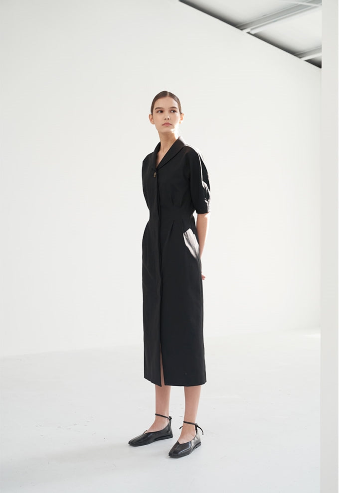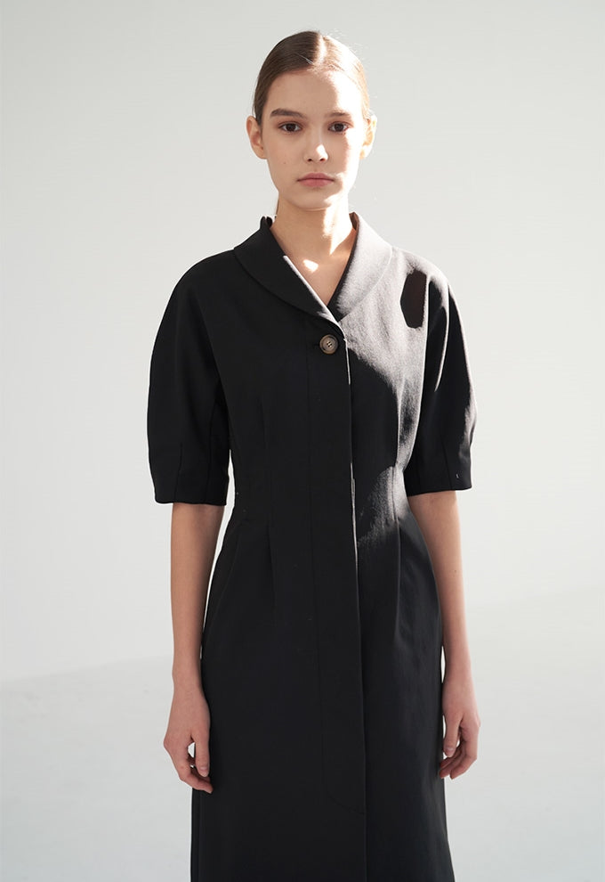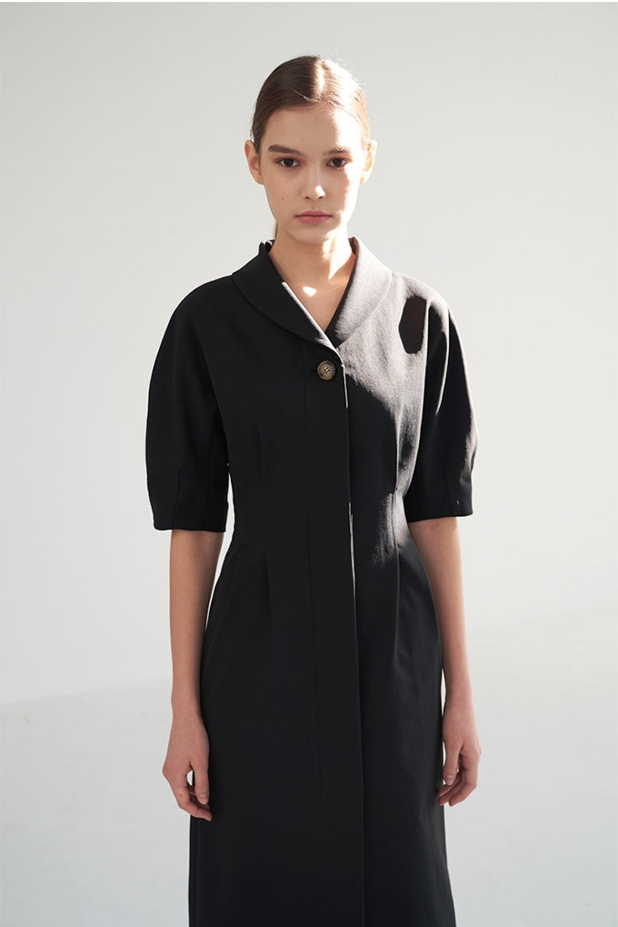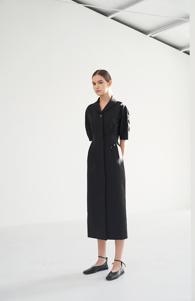 A striking blend of minimalism and structure, this refined midi dress by Laura Ren is crafted from breathable linen, ideal for polished day-to-evening styling. The design features gently sculpted half sleeves and an asymmetric shawl collar that leads into a concealed placket with a single statement button. A tailored fit through the bodice and skirt elongates the silhouette, while the back vent ensures ease of movement. This piece offers an architectural aesthetic with soft drape, making it a sophisticated choice for gallery events, business functions, or contemporary occasion wear.