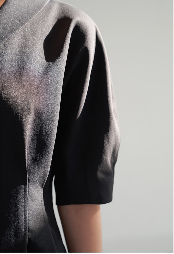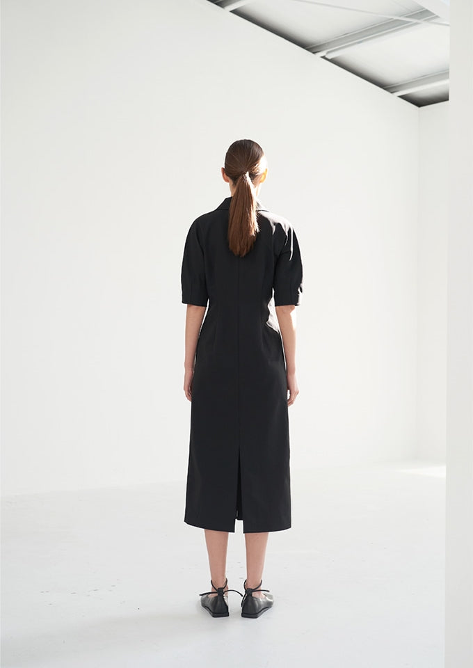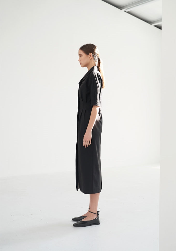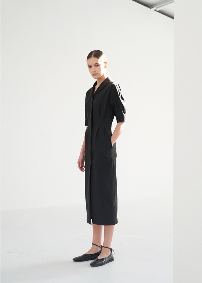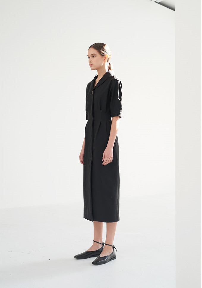 A striking blend of minimalism and structure, this refined midi dress by Laura Ren is crafted from breathable linen, ideal for polished day-to-evening styling. The design features gently sculpted half sleeves and an asymmetric shawl collar that leads into a concealed placket with a single statement button. A tailored fit through the bodice and skirt elongates the silhouette, while the back vent ensures ease of movement. This piece offers an architectural aesthetic with soft drape, making it a sophisticated choice for gallery events, business functions, or contemporary occasion wear.