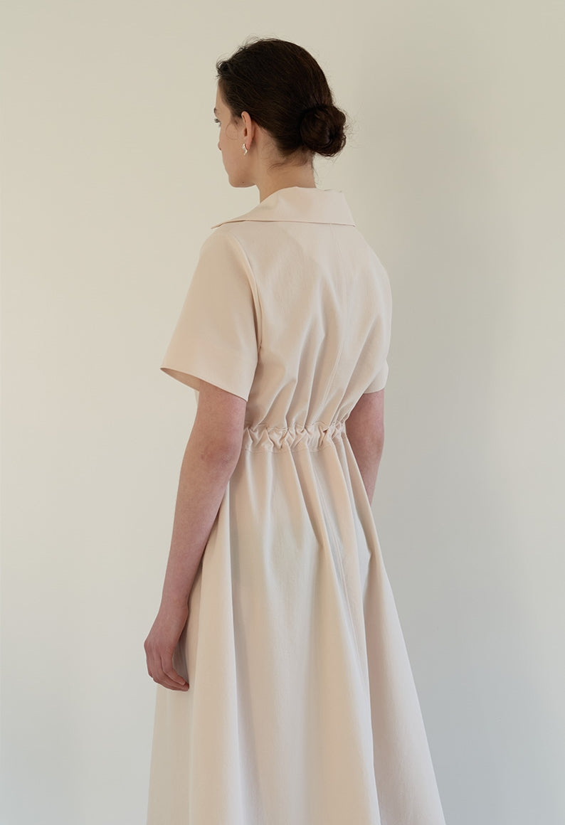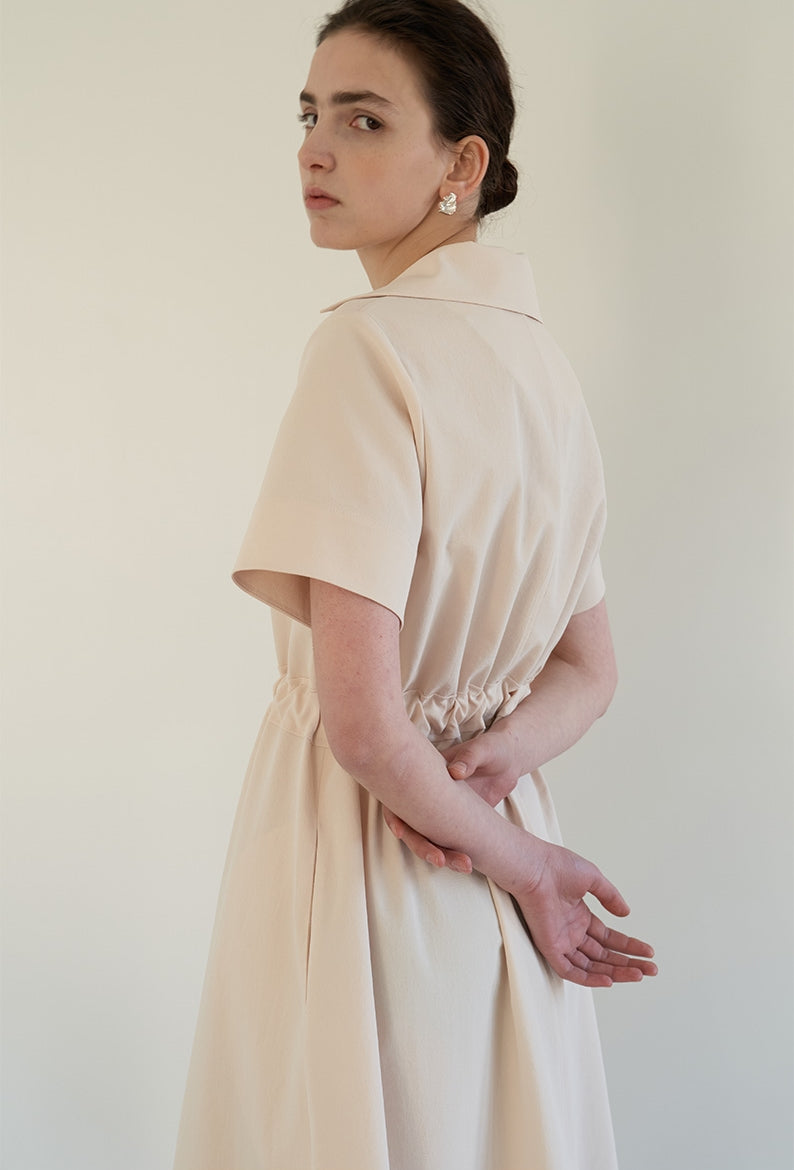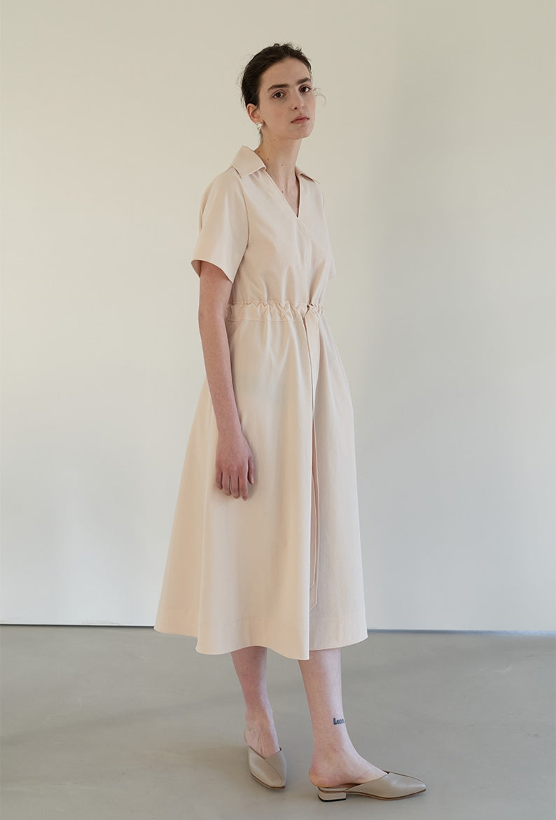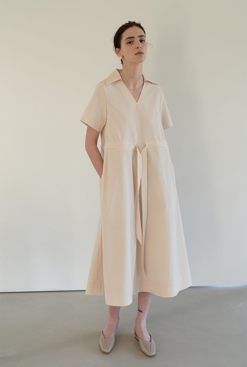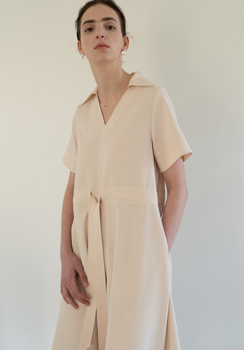 This effortlessly elegant midi dress from Laura Ren is crafted in airy linen, offering a gentle drape and breathable feel ideal for warm seasons. The design features a soft open collar, relaxed short sleeves, and a subtle V-neckline that flatters the neckline. A gathered waist with a front-tie detail cinches gently to create definition without sacrificing comfort. With its flowing A-line silhouette and minimalist refinement, this dress is perfect for serene daywear, travel wardrobes, or resort-ready styling. Graceful and versatile, it transitions seamlessly from casual mornings to elevated afternoons.