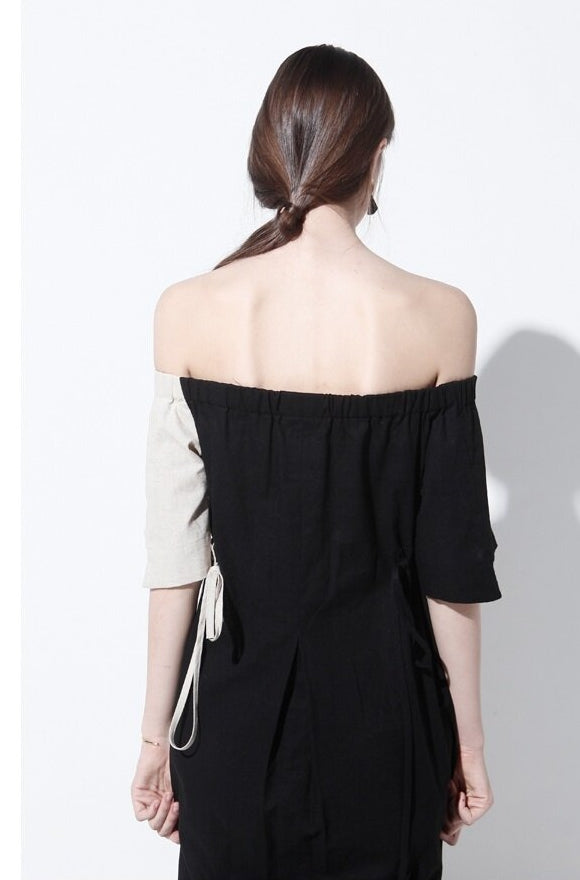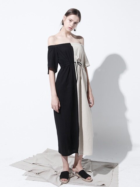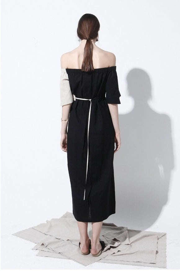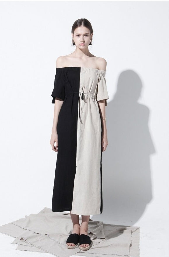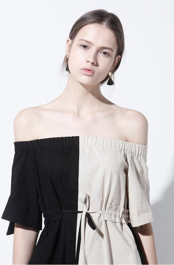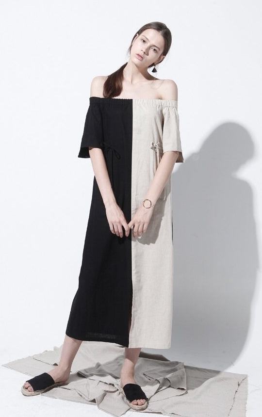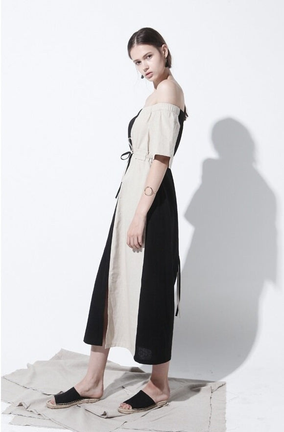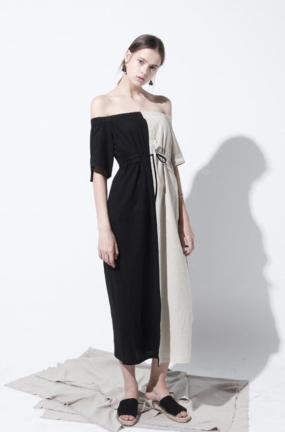 Effortlessly chic, this off-shoulder midi dress by Laura Ren is crafted from lightweight, breathable linen to keep you cool and elegant all day long. Designed with a striking half-and-half colorblock finish, it features an elasticated shirred neckline that drapes beautifully across the shoulders, adding a romantic and modern edge. The relaxed silhouette is cinched with a delicate tie waist to enhance your shape, while short sleeves and a midi hemline offer the perfect balance of comfort and sophistication. This versatile piece transitions seamlessly from daytime wear to evening outings and is a must-have staple for those who appreciate refined yet artistic wardrobe essentials.