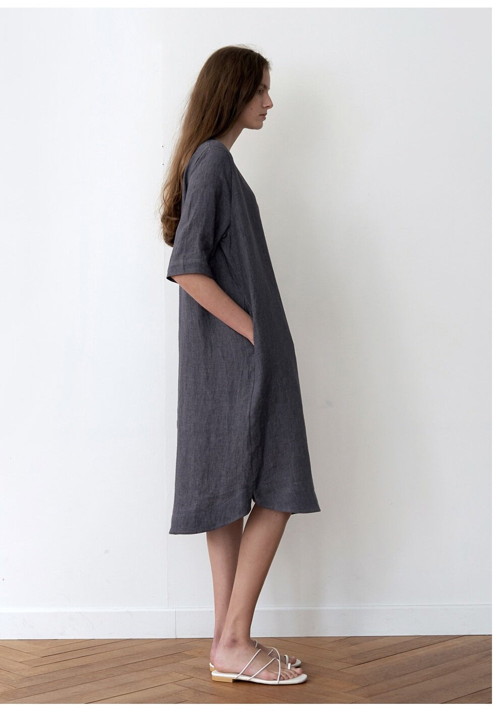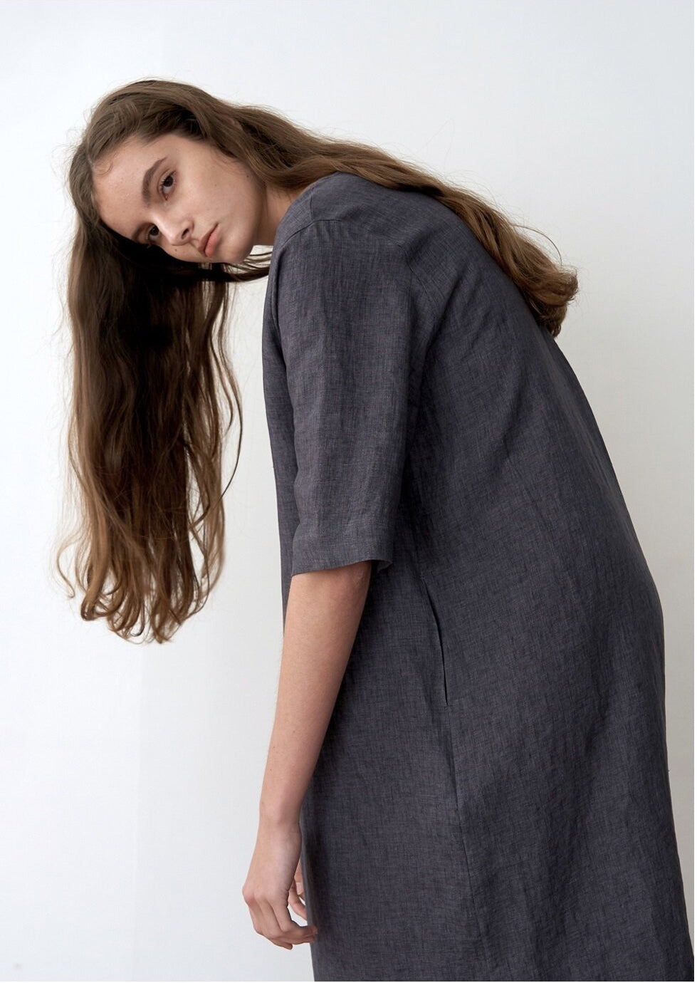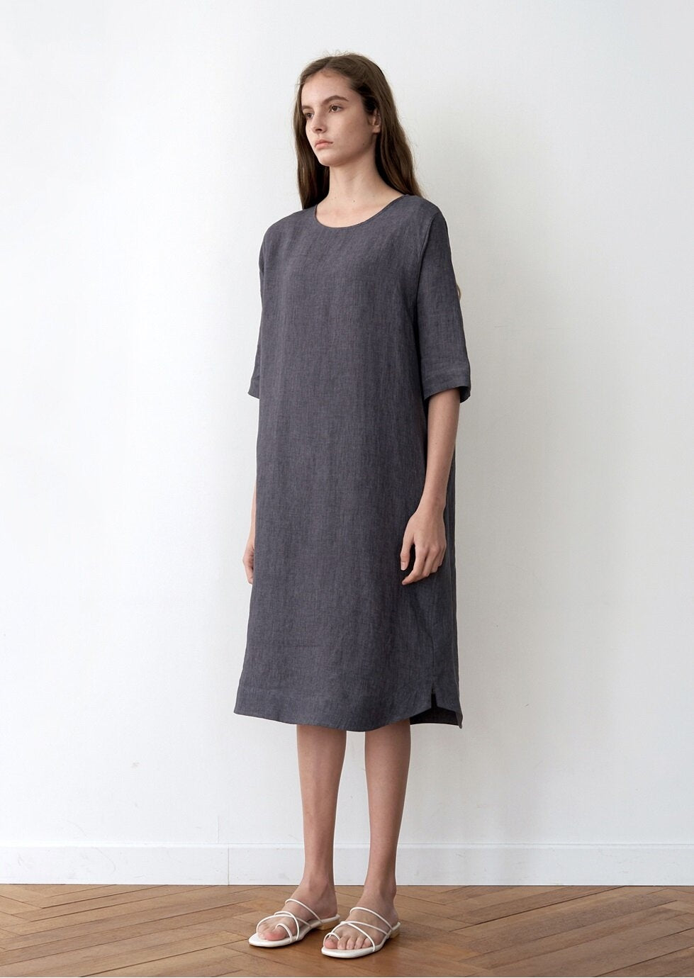 - Made from 100% breathable natural linen for all-day comfort - Relaxed straight silhouette with soft back pleat for fluid movement - Classic round neckline and mid-length sleeves for a timeless look - Side slits at the hem for ease and elegance in every step - Designed by Laura Ren for refined, minimalist wardrobe essentials