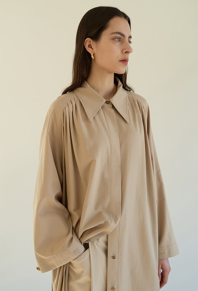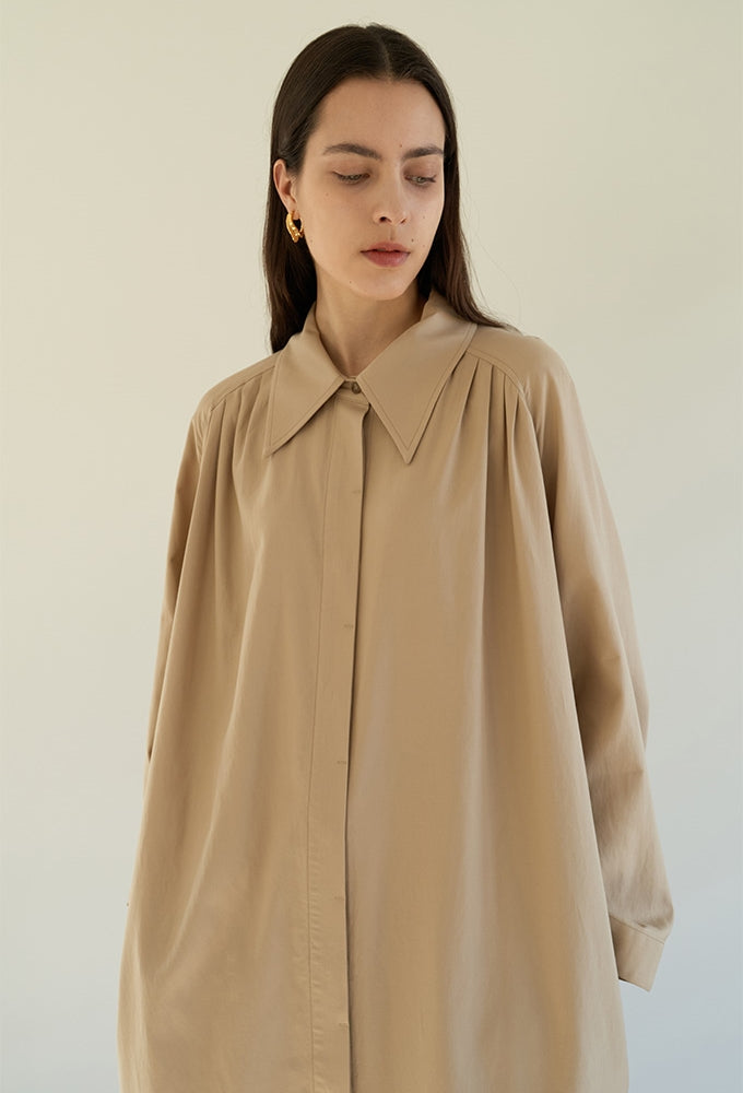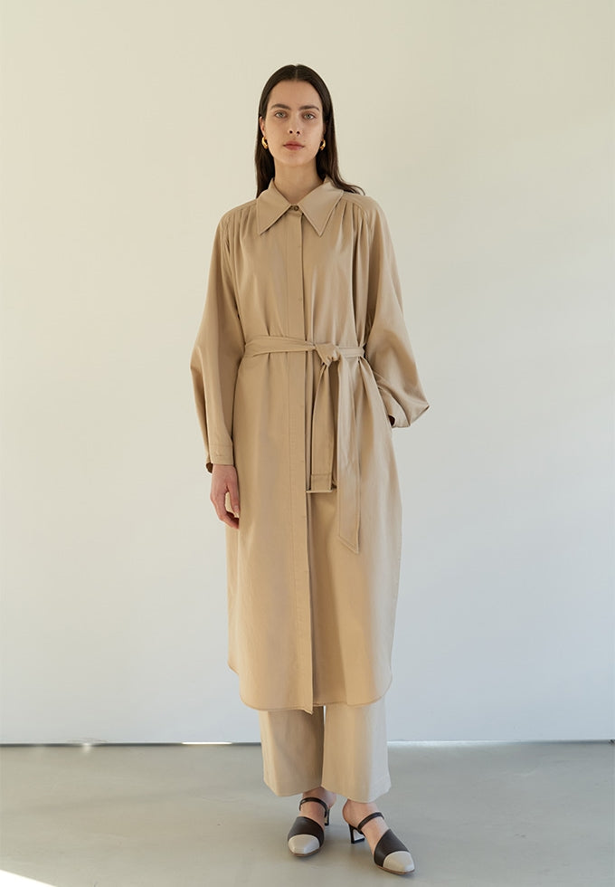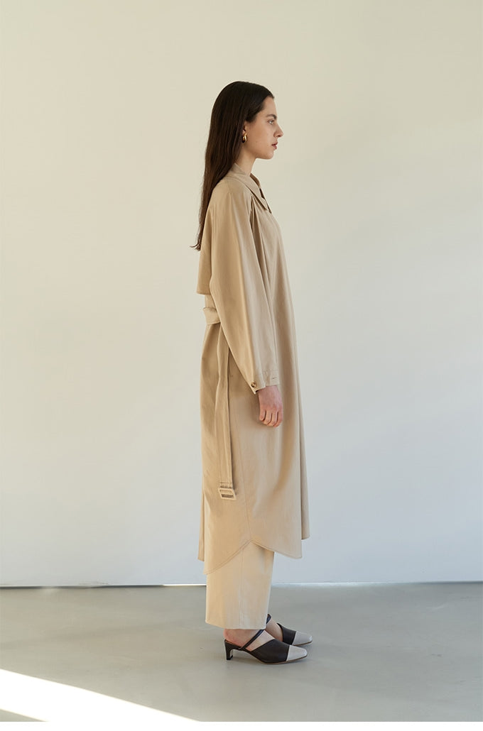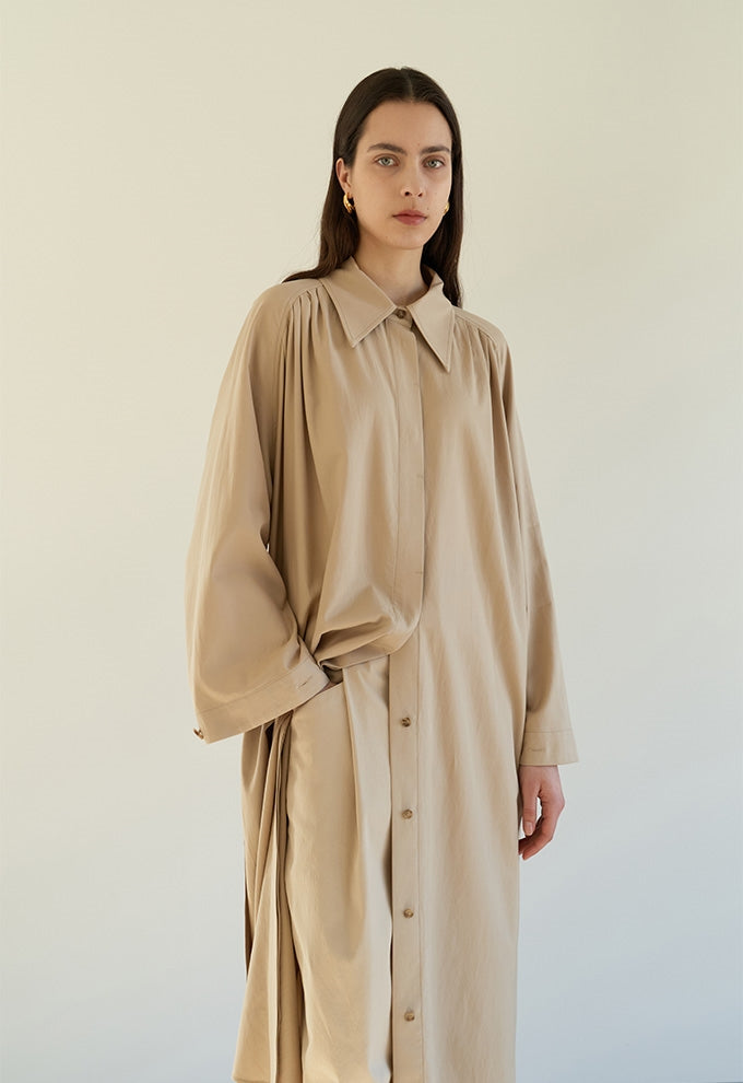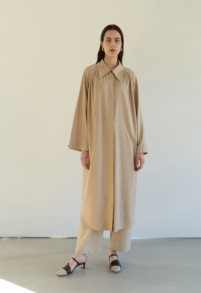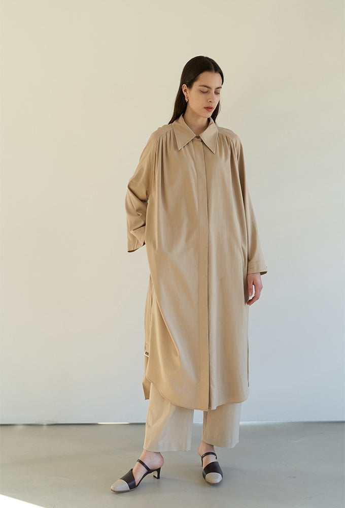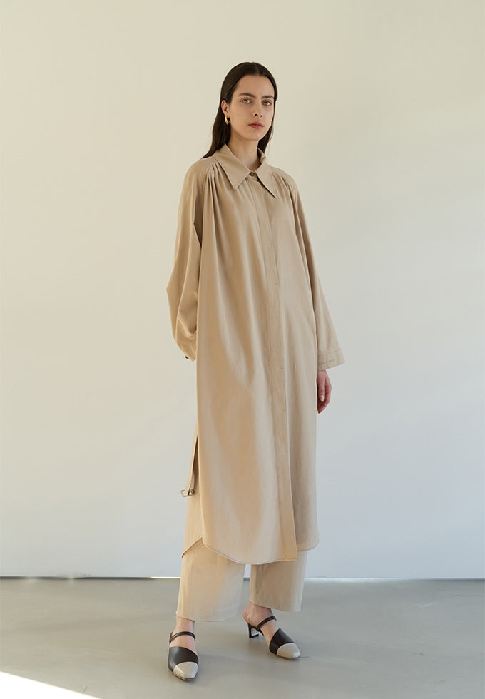Designed for versatile layering, this softly structured coat dress by Laura Ren is crafted from a linen-blend fabric that offers both breathability and elegant drape. Featuring a classic pointed collar, concealed button placket, and full-length sleeves, the piece is cinched at the waist with a detachable tie belt for adjustable shape. The back pleat adds dimension and ease of movement, while the curved hemline softens the tailored silhouette. Whether worn over matching trousers or styled as a standalone dress, this minimalist essential transitions effortlessly across seasons with refined simplicity.