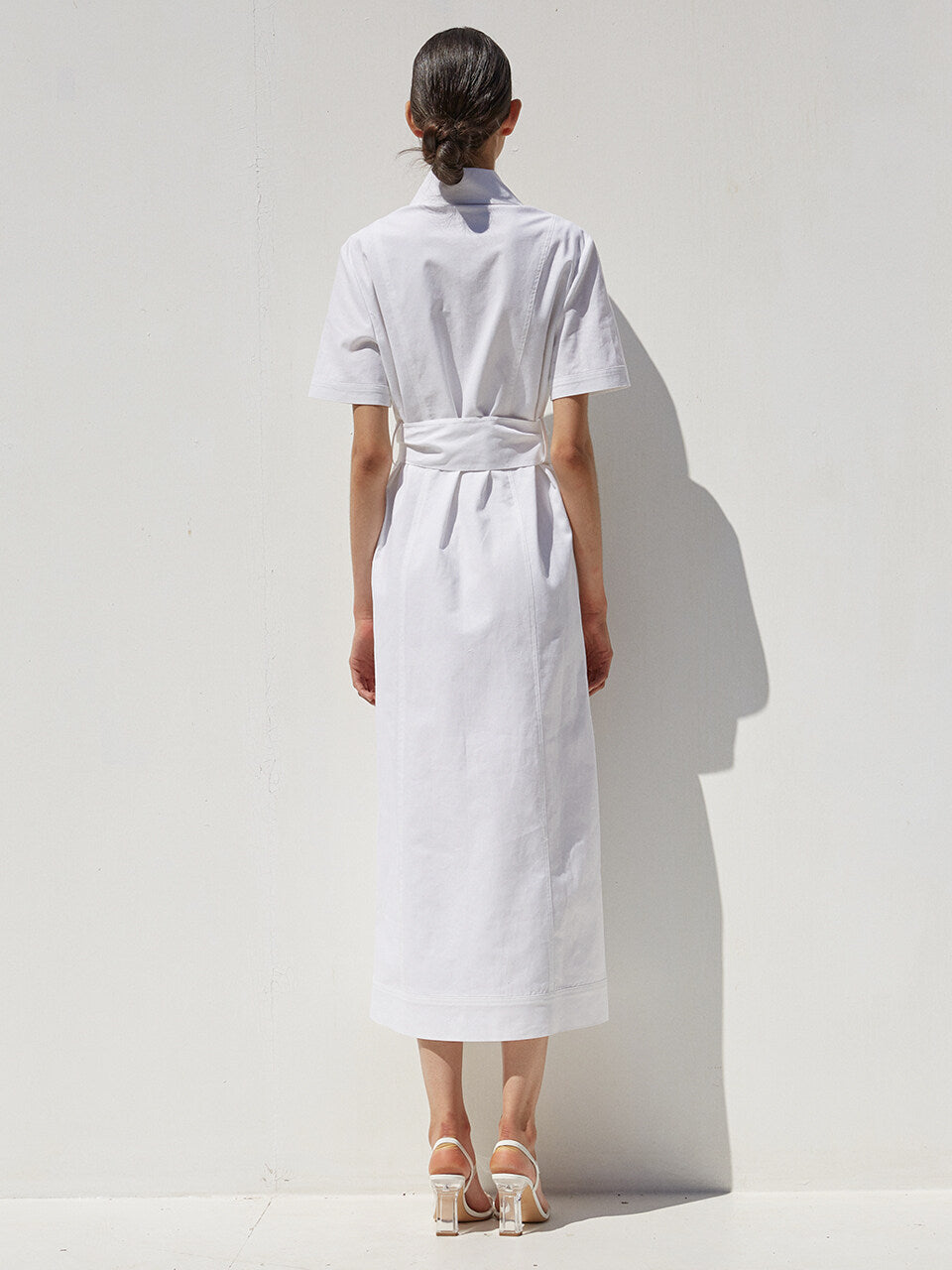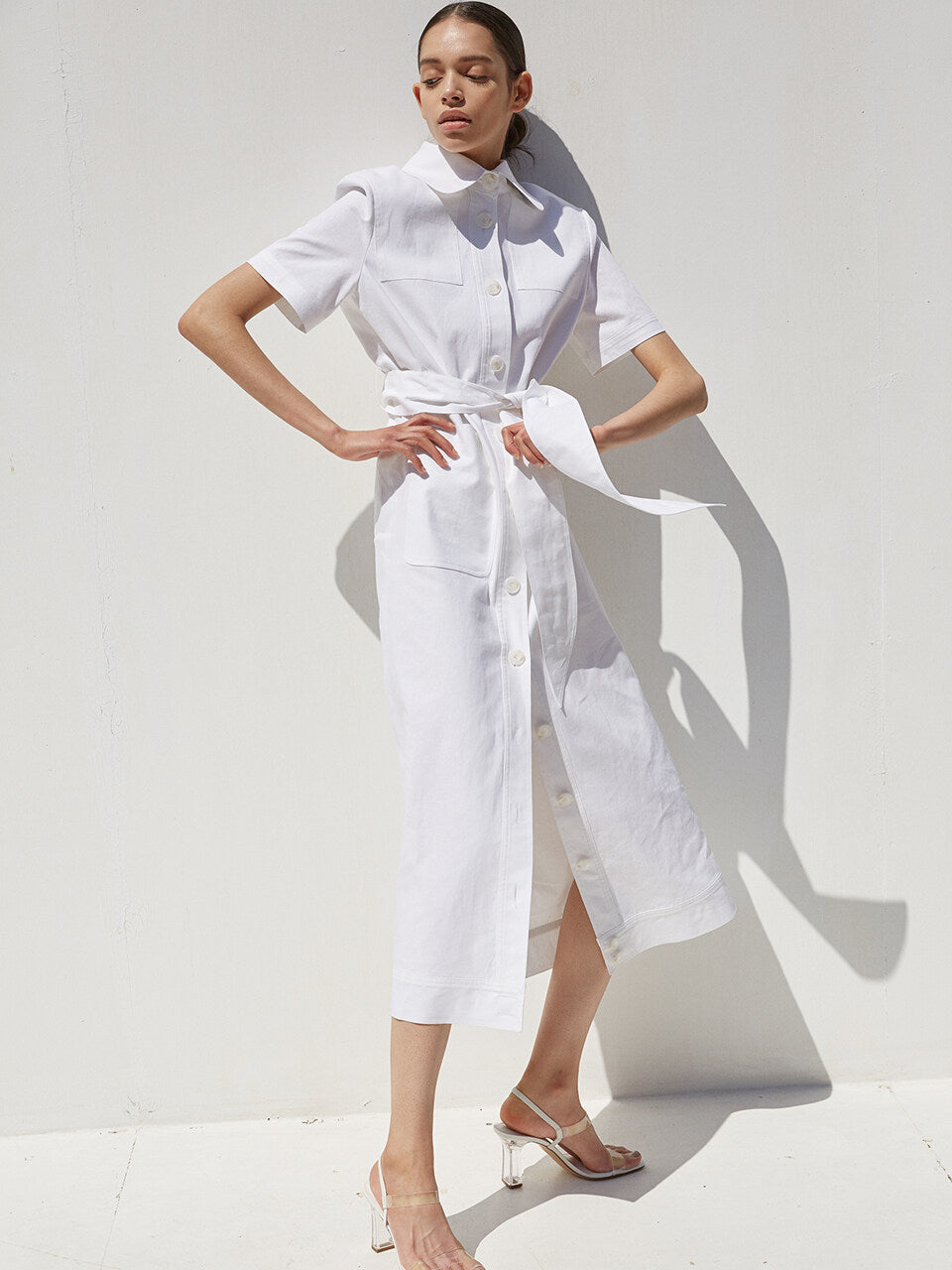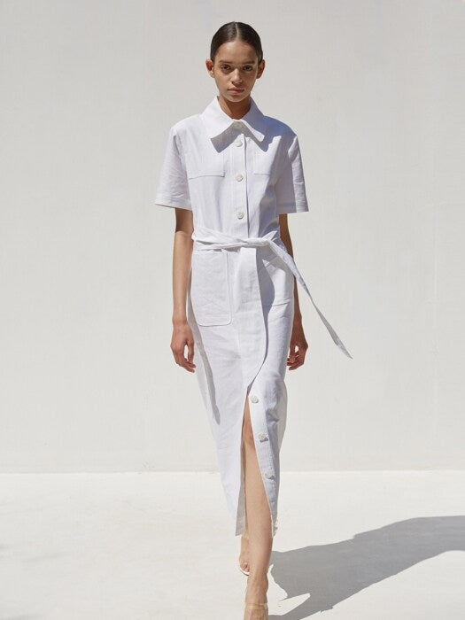 A timeless fusion of structure and softness, this short-sleeve linen midi dress by Laura Ren is tailored for refined simplicity. Made from breathable, high-quality linen, the dress features a button-down front, an oversized collar, and a self-tie belt that cinches the waist for a flattering silhouette. Front patch pockets enhance its utilitarian elegance, while the midi length offers a polished and versatile finish. Whether styled with heels or flats, this dress transitions seamlessly from city outings to warm-weather getaways. An essential piece for elevated everyday dressing and minimalist wardrobes.