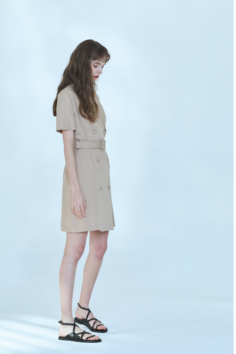 Refined and versatile, this linen blazer dress from Laura Ren blends tailored structure with breathable comfort. Designed in a short-sleeve silhouette, it features a sharp notched lapel, double-breasted front, and tonal fabric-covered buttons for a cohesive look. The matching waist belt cinches the shape, enhancing the figure while adding a polished touch. Crafted from lightweight linen, this dress is perfect for warm-weather elegance, whether styled for day-to-day wear or elevated occasions. A sleek addition to Laura Ren’s summer wardrobe lineup.