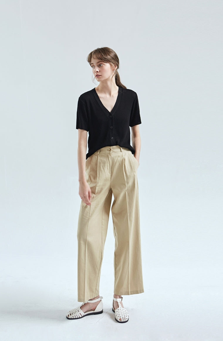 Refined and effortlessly versatile, this linen knit top from Laura Ren is a wardrobe essential for modern dressing. Crafted from a breathable, natural linen-blend fabric, it features a flattering V-neckline, front button closure, and softly ribbed texture for a structured yet relaxed silhouette. The short sleeves and lightweight construction make it ideal for warm-weather layering, while its minimalist design ensures it pairs beautifully with both tailored trousers and casual denim. Elevate your daily style with this timeless piece that reflects Laura Ren’s commitment to quality craftsmanship and elegant simplicity.