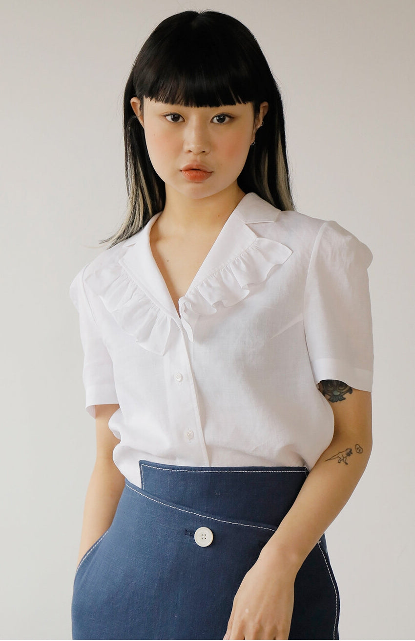 This elegant short sleeve blouse by Laura Ren is crafted from premium breathable linen, offering an airy and polished look perfect for warm weather. Featuring a classic button-up front and a romantic ruffled collar, it’s designed to blend modern femininity with timeless charm. Ideal for both casual and semi-formal occasions, this linen blouse pairs effortlessly with high-waisted skirts or tailored trousers. The natural texture of the linen enhances the comfort while maintaining a crisp silhouette. Designed with a focus on craftsmanship and clean lines, this piece is a wardrobe essential for women seeking both style and versatility.