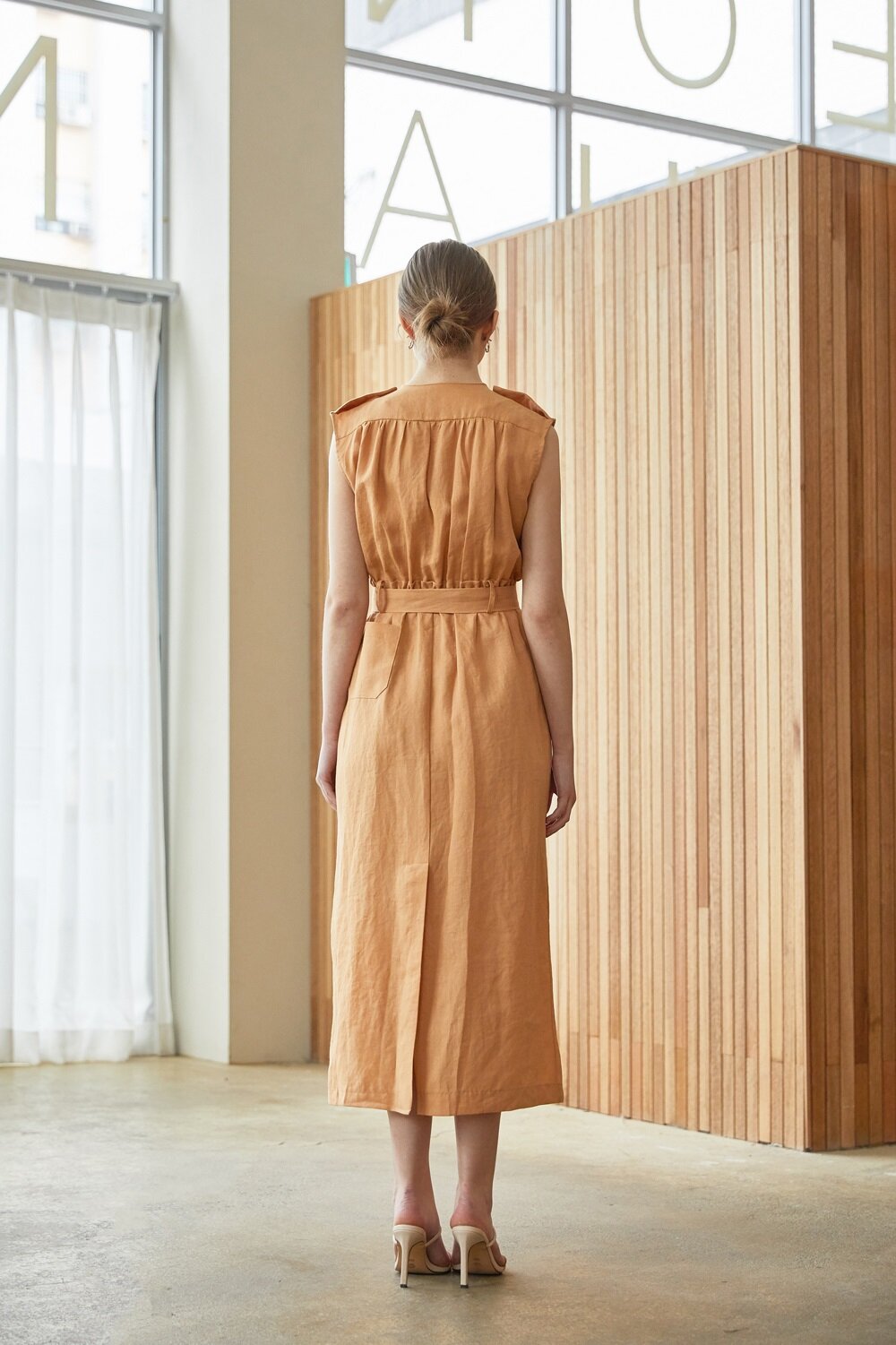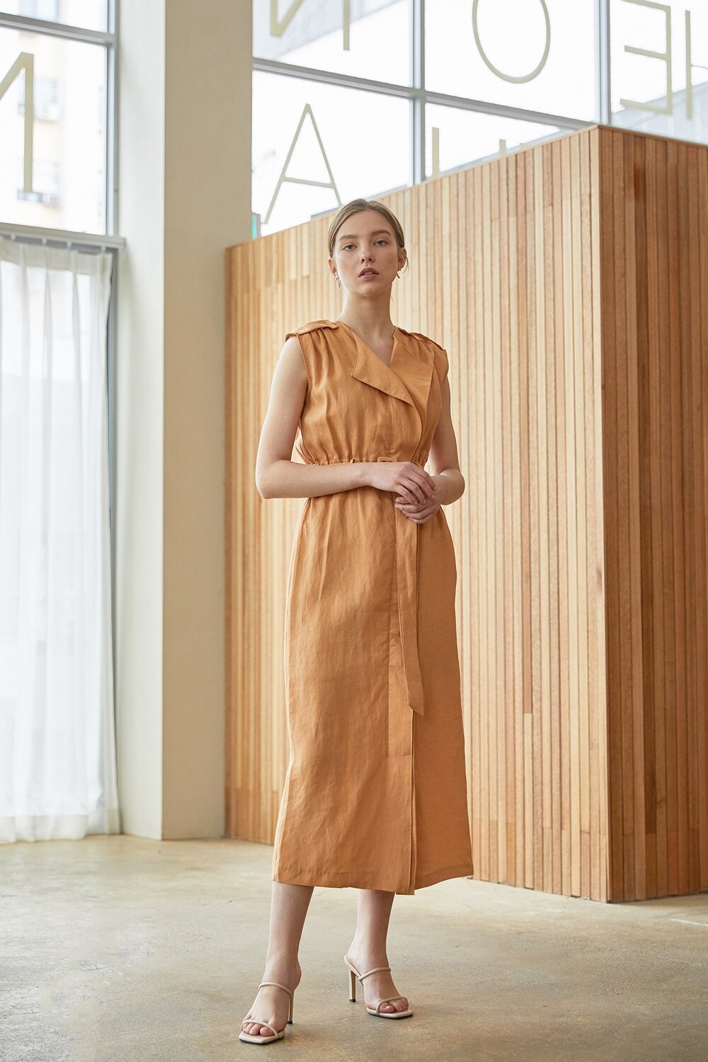 Sleeveless Belted Midi Linen Dress with Notch Lapel and Softly Structured Silhouette