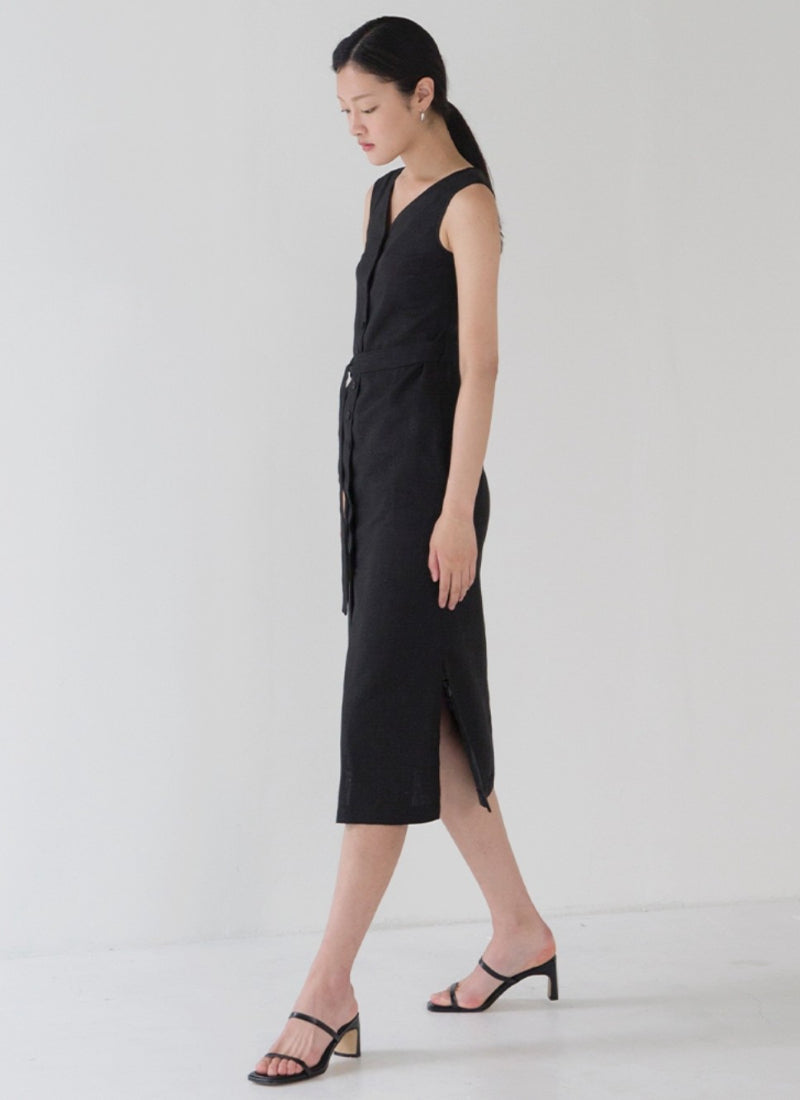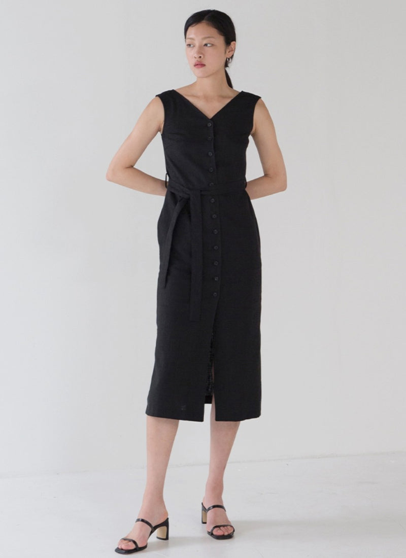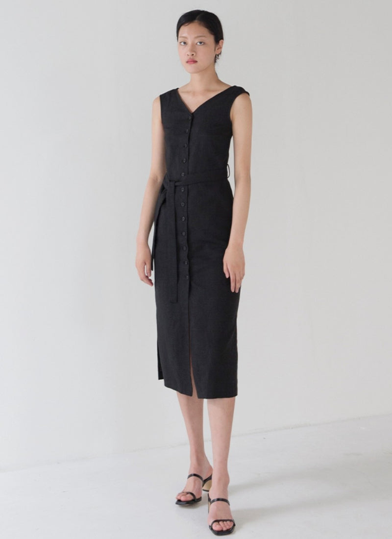 Chic, structured, and effortlessly wearable, this sleeveless linen midi dress by Laura Ren is a wardrobe essential for warm-weather sophistication. Featuring a flattering V-neckline, full button-front closure, and a matching fabric belt, this piece sculpts the waist while remaining breathable and light. The tailored silhouette is enhanced with subtle side slits for ease of movement, making it ideal for both casual and refined occasions. Crafted from premium natural linen, this dress reflects Laura Ren’s commitment to clean lines, timeless elegance, and elevated comfort for the modern woman.