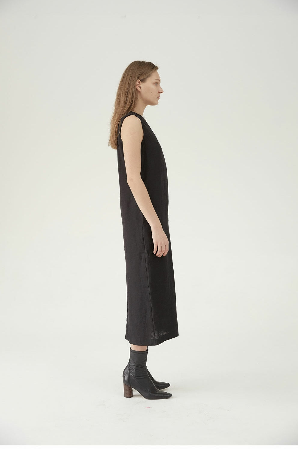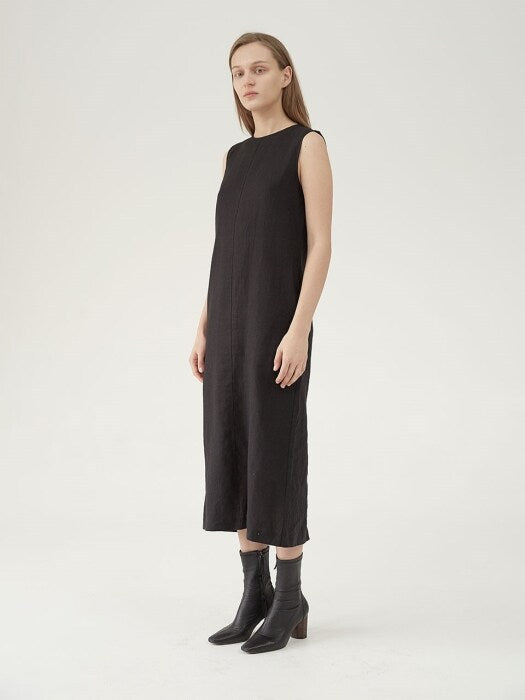 - Premium quality linen fabric for breathable all-day comfort - Sleeveless design with a refined high neckline for a sleek look - Streamlined midi silhouette ideal for minimalist styling - Invisible back zipper for a clean and tailored finish - Versatile piece suitable for formal, casual, or resort wear