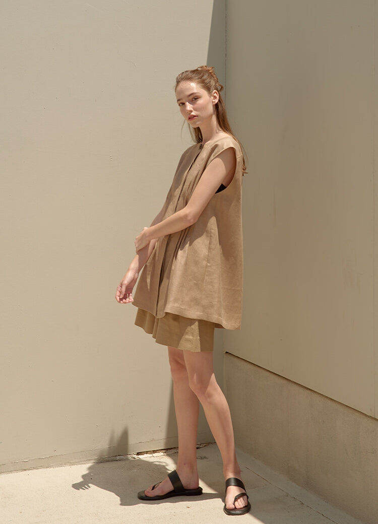 Elevate your summer wardrobe with this sleeveless linen top from Laura Ren, designed for effortless elegance and comfort. Crafted from premium natural linen, it features a clean, structured silhouette with a slightly boxy fit that flatters a variety of body types. The minimalist front pleats and extended shoulder line add a refined touch, perfect for pairing with tailored shorts, wide-leg pants, or layered skirts. Lightweight and breathable, it’s ideal for warm weather and versatile enough for both work and leisure. Laura Ren brings understated sophistication to this staple, making it a timeless essential in any modern woman’s closet.