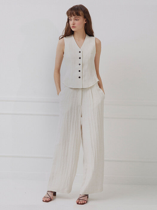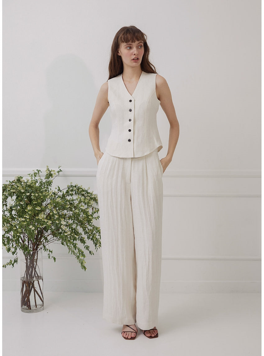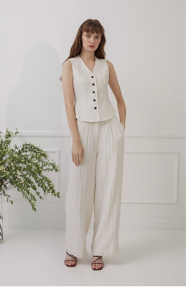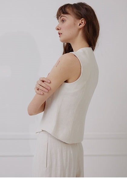 The sleeveless linen top by Laura Ren offers effortless sophistication with a tailored yet relaxed silhouette. Crafted in breathable linen, this piece features a flattering V-neckline, contoured seams, and a curved hem that softly skims the waist. The structured shape is elevated with a row of contrast buttons, creating a timeless aesthetic perfect for layering or standalone styling. Designed to pair seamlessly with wide-leg trousers or skirts, this top transitions with ease from weekday refinement to weekend minimalism. The Laura Ren collection celebrates modern essentials with precise cuts and elevated texture.