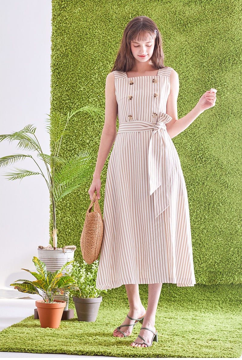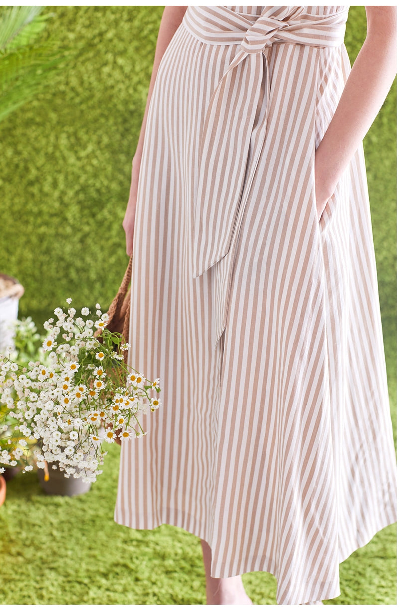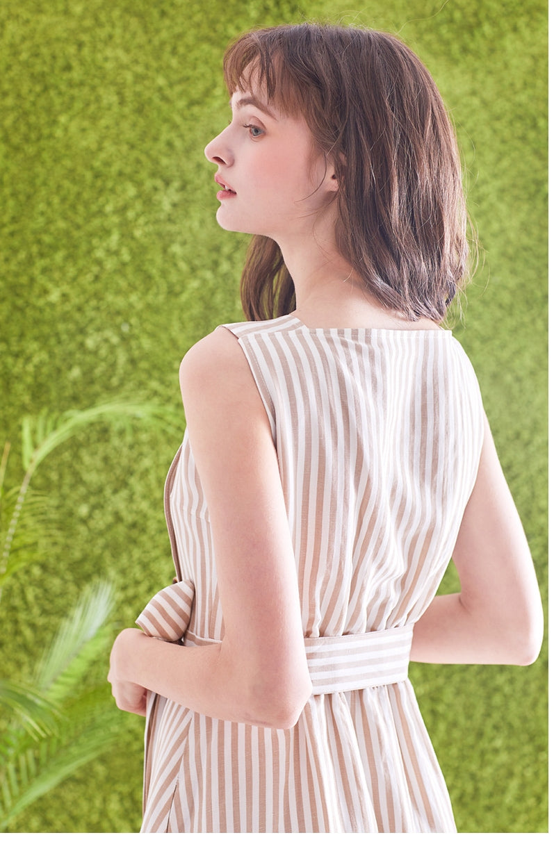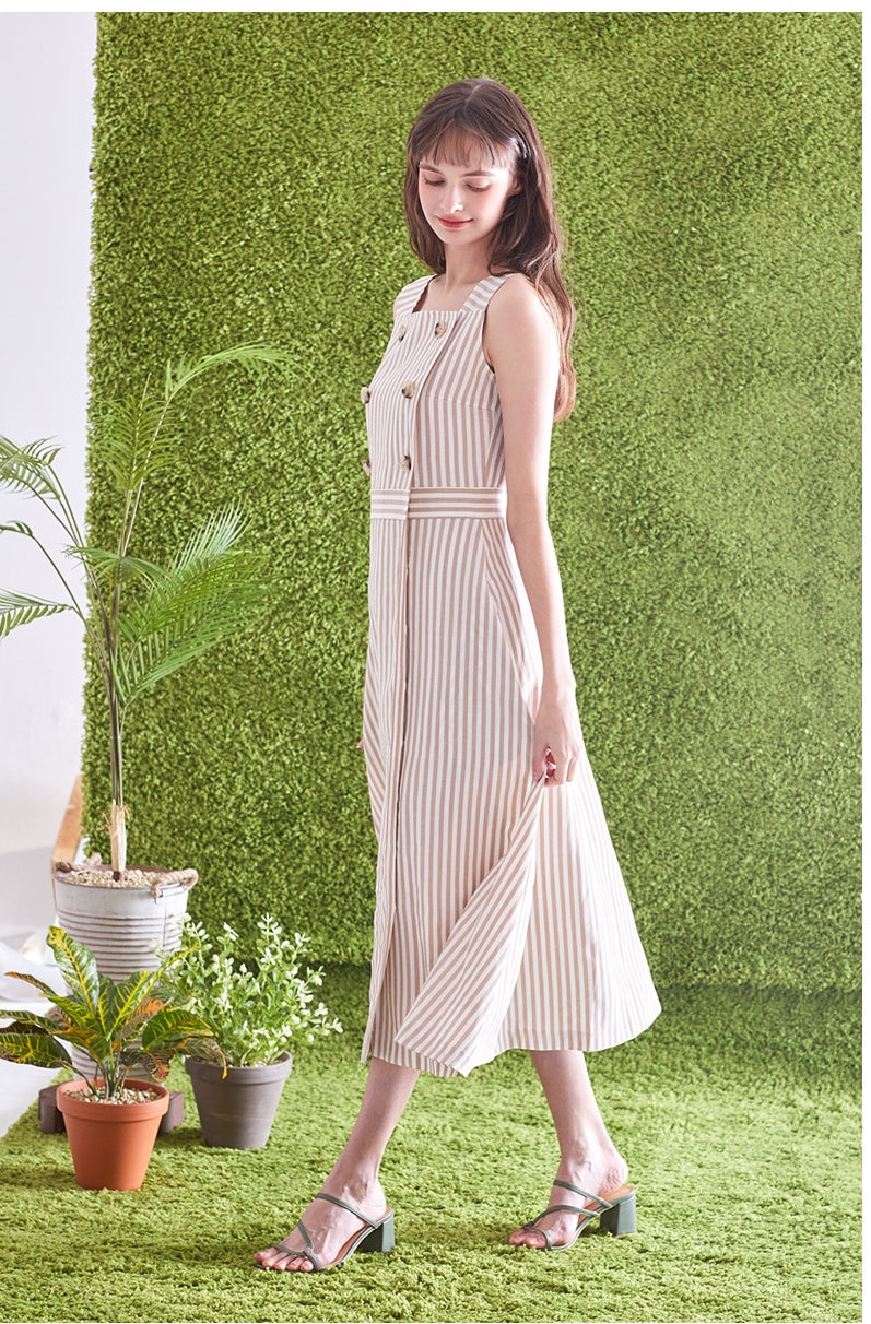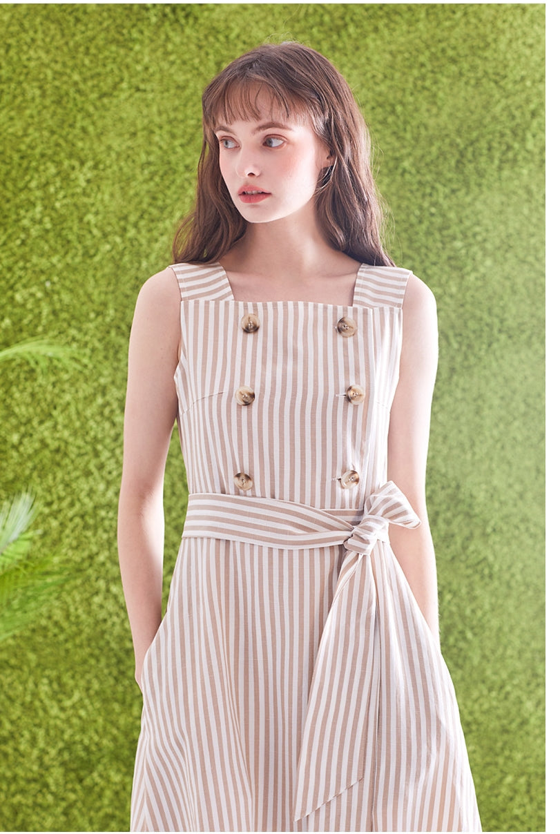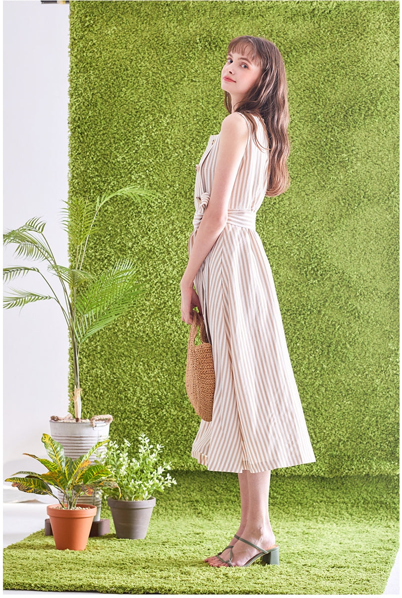 Add refined ease to your warm-weather wardrobe with this sleeveless striped linen midi dress from Laura Ren. Tailored from airy, premium linen, this piece features a flattering square neckline, double-breasted button detailing, and a self-tie waist belt that defines the silhouette. The vertical stripe pattern elongates the form, while the midi length and flowy A-line cut offer comfort and grace with every step. Ideal for vacations, brunches, or casual afternoons, this dress effortlessly blends classic tailoring with relaxed elegance. Laura Ren delivers timeless sophistication with every stitch, crafted for confident, modern women.
