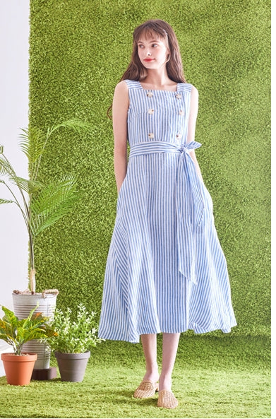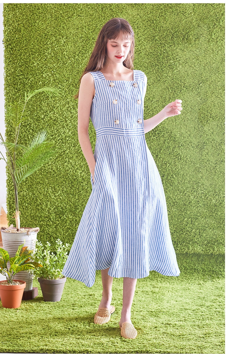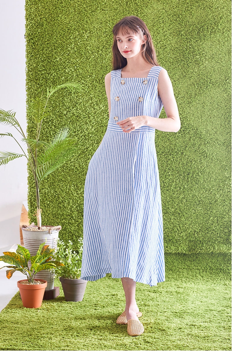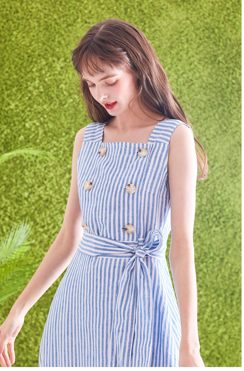 Timeless and tailored, this striped linen midi dress by Laura Ren brings effortless refinement to your wardrobe. Made from breathable, high-quality linen, the dress features a structured square neckline, double-breasted button accents, and a self-tie waist belt that cinches the silhouette perfectly. The vertical stripes elongate the figure, while the sleeveless cut and midi length offer a breezy, flattering fit ideal for spring and summer. Designed for garden parties, day events, or casual outings, this Laura Ren piece blends classic nautical charm with modern minimalism—perfect for women who value both elegance and comfort.