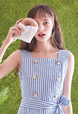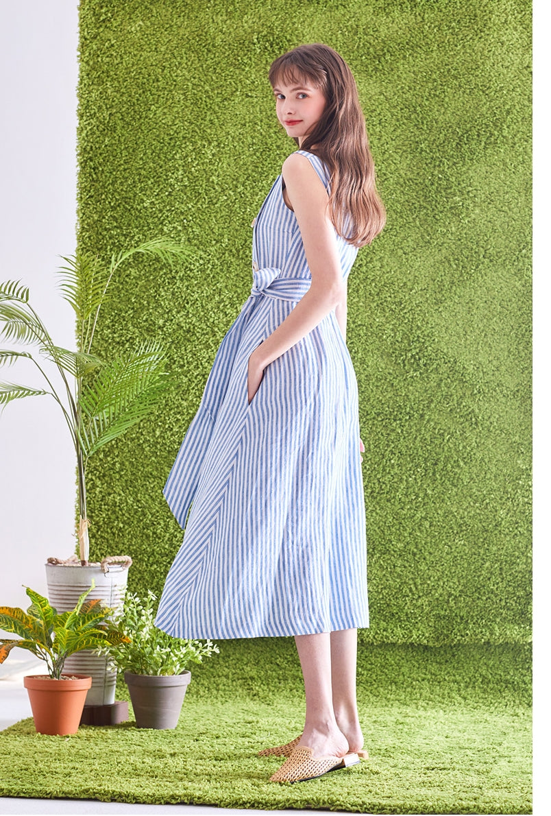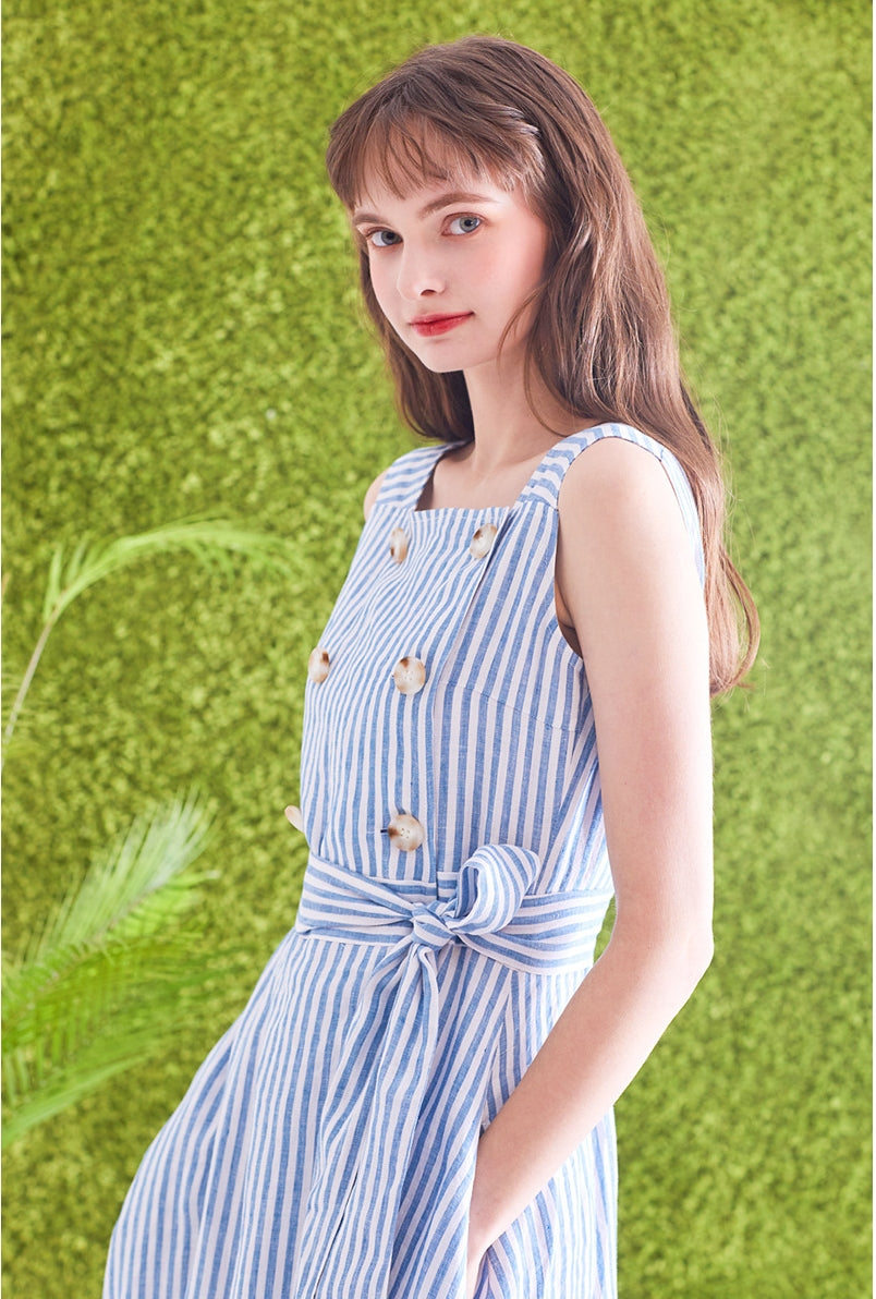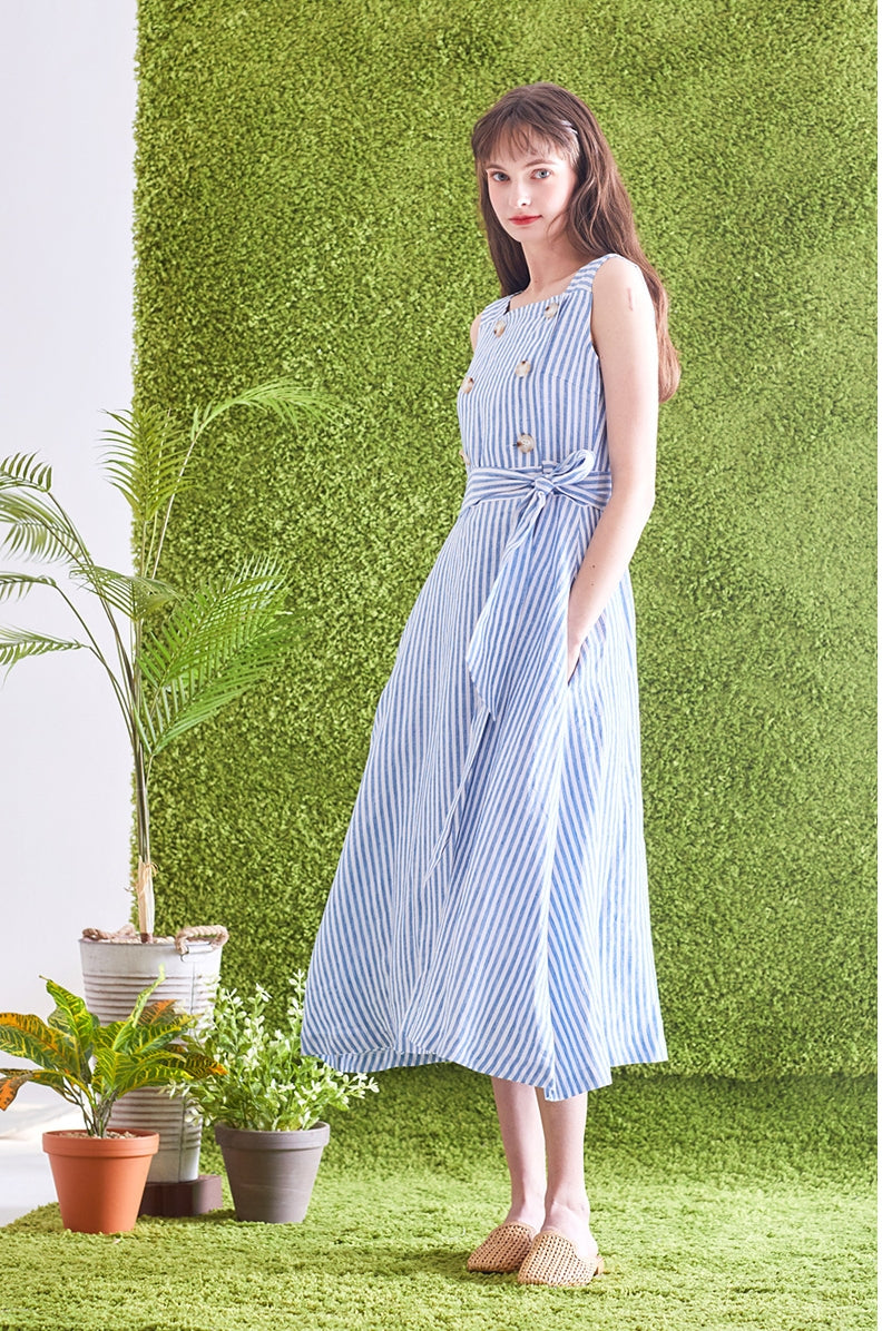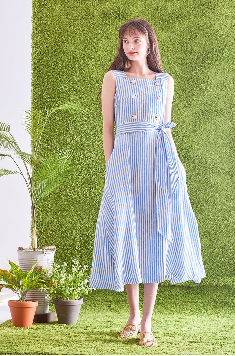 Timeless and tailored, this striped linen midi dress by Laura Ren brings effortless refinement to your wardrobe. Made from breathable, high-quality linen, the dress features a structured square neckline, double-breasted button accents, and a self-tie waist belt that cinches the silhouette perfectly. The vertical stripes elongate the figure, while the sleeveless cut and midi length offer a breezy, flattering fit ideal for spring and summer. Designed for garden parties, day events, or casual outings, this Laura Ren piece blends classic nautical charm with modern minimalism—perfect for women who value both elegance and comfort.