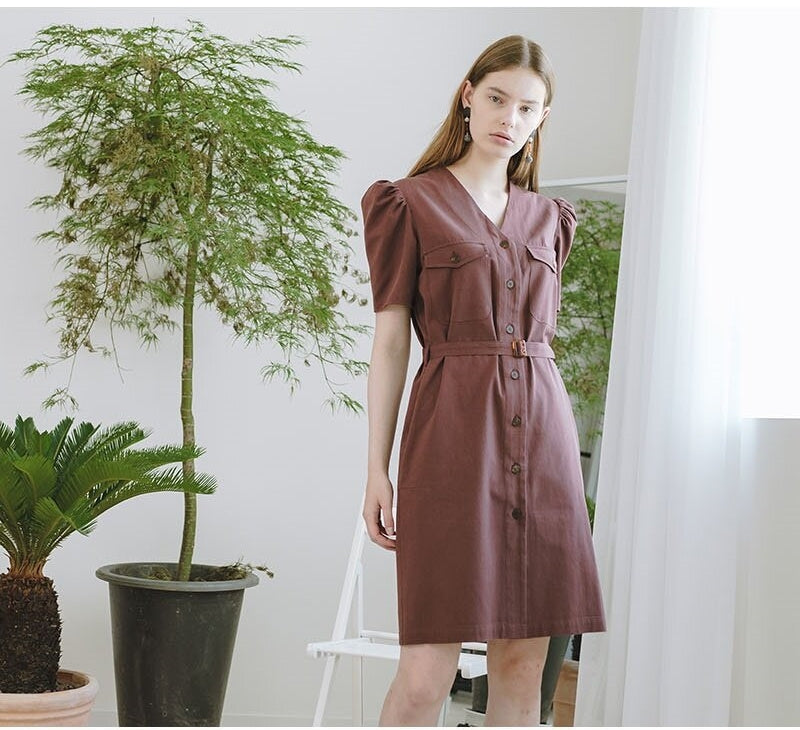 Step into effortless sophistication with this tailored linen dress by Laura Ren. Designed with structured puff sleeves and a refined V-neckline, this dress features a belted waist that accentuates the silhouette and front flap pockets that add functional detail. The breathable linen fabric ensures comfort for all-day wear while maintaining a polished look ideal for both work and weekend occasions. With a button-down front for ease and versatility, this piece balances timeless tailoring with a feminine edge. Elevate your warm-weather wardrobe with Laura Ren’s signature aesthetic—understated, clean, and elegantly modern.