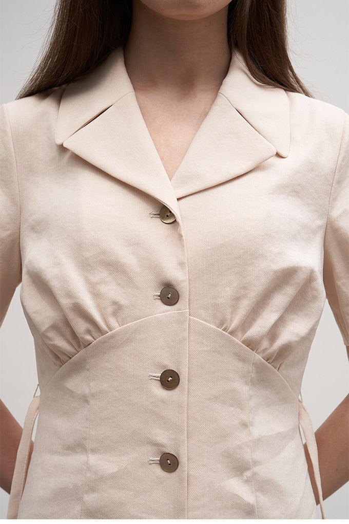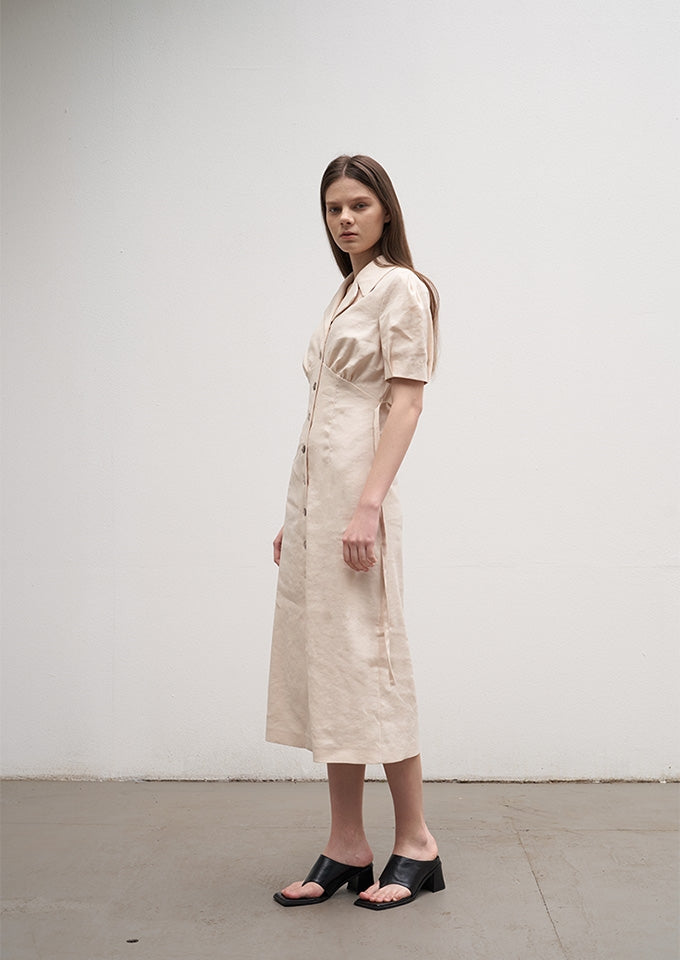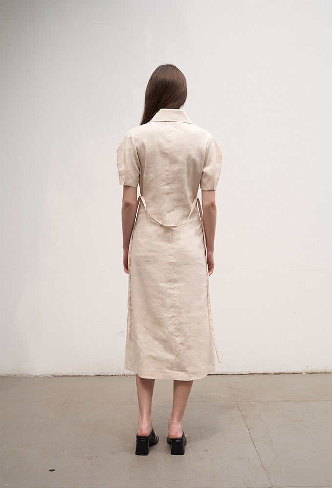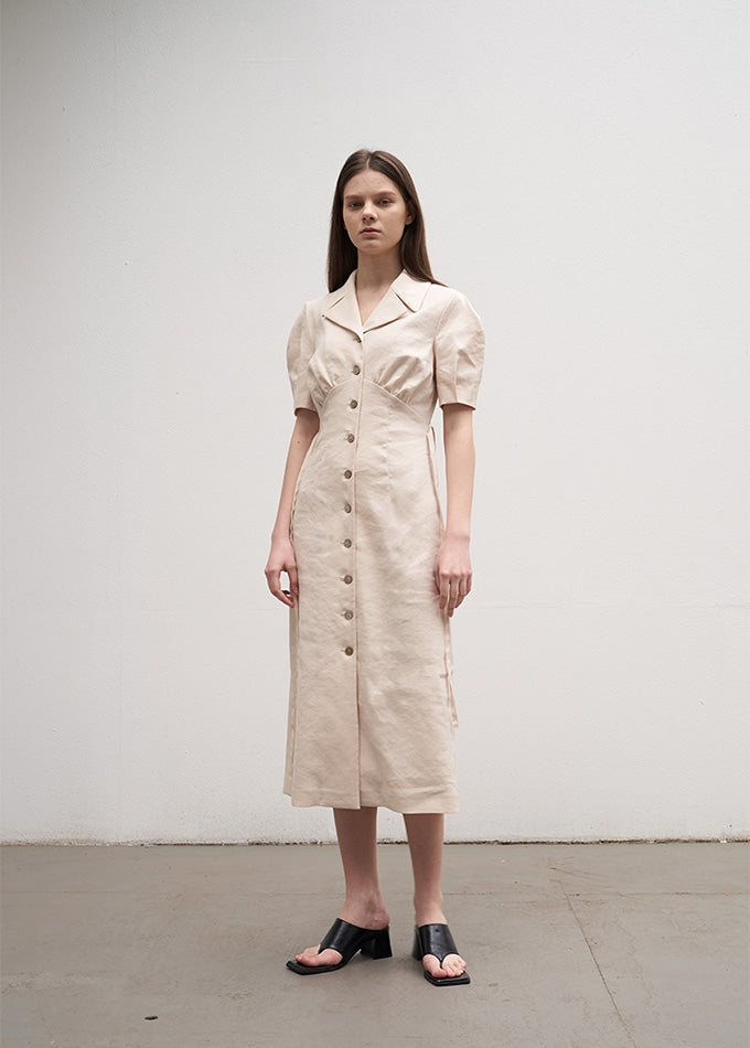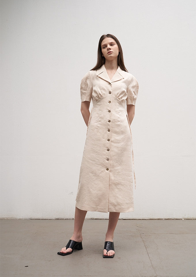 Experience timeless tailoring with this refined midi dress from Laura Ren, crafted in breathable natural linen for effortless elegance. Featuring a structured silhouette with softly puffed short sleeves, a sharp notched lapel collar, and a full button-down front, this piece blends modern femininity with vintage charm. A gently cinched waist and subtle back ties create a flattering, adjustable fit that enhances your shape. Perfect for elevated daywear, office occasions, or chic weekend outings, this dress redefines sophistication with natural texture and classic design details.