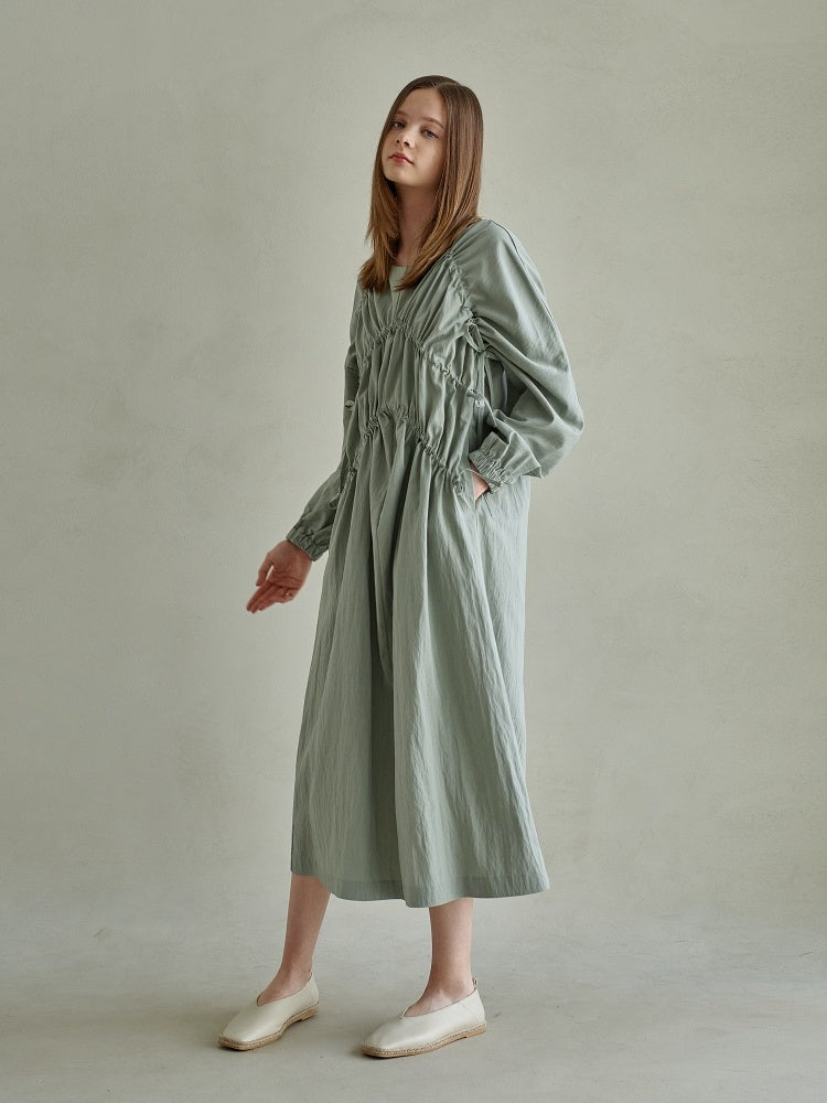 Embrace understated elegance in this sculptural gathered midi dress from Laura Ren, crafted from lightweight, breathable linen. The intricately ruched bodice adds textural depth and visual intrigue, enhanced by artfully placed drawstring gathers along the sides. Full-length sleeves with elastic cuffs and a flowing silhouette create a relaxed, graceful profile. Designed for refined comfort, this dress pairs effortlessly with minimalist footwear and natural accessories. Laura Ren’s signature aesthetic shines through in this piece—perfect for modern women who value craftsmanship, form, and serene style.