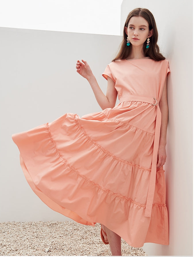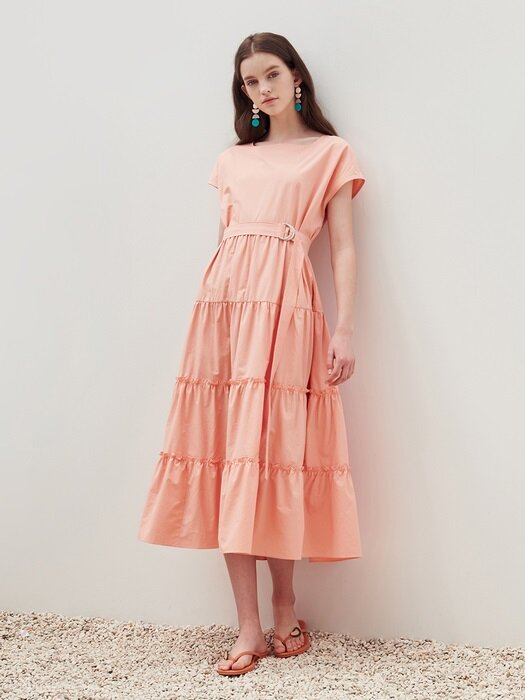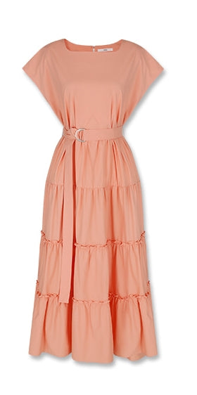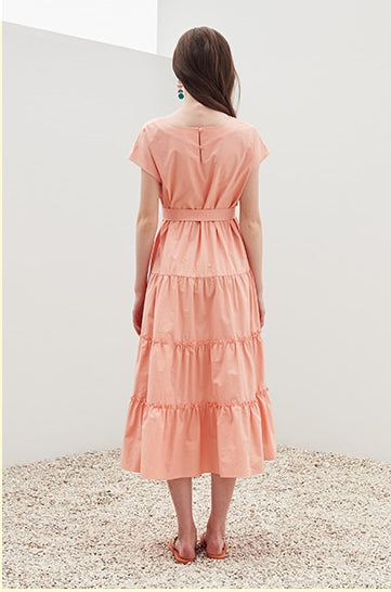 - Made from breathable, structured cotton poplin fabric - Tiered midi silhouette adds volume and elegant movement - Adjustable belt defines the waist for a feminine shape - Cap sleeves offer a softly structured finish - Perfect for summer occasions, casual chic, and timeless daywear