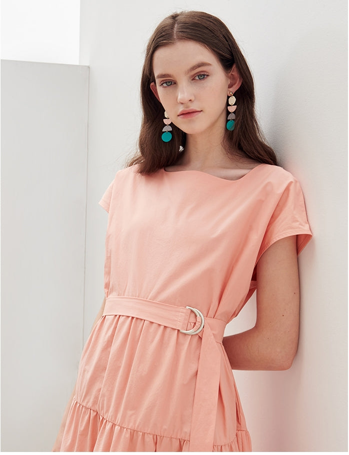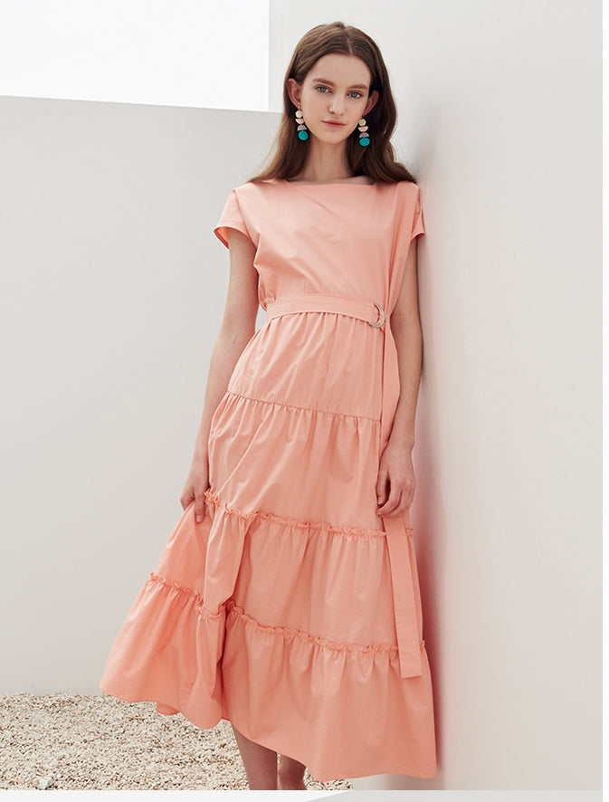 Tiered Cotton Poplin Midi Dress with Belt and Cap Sleeves – Lightweight Feminine Silhouette