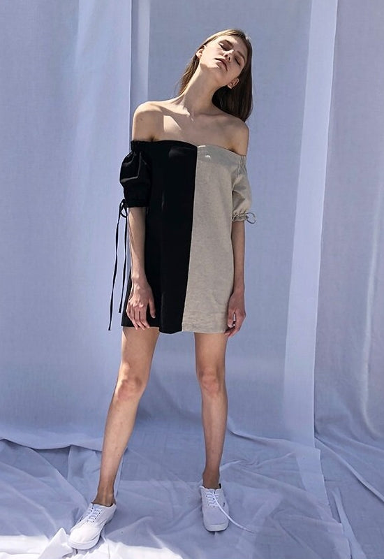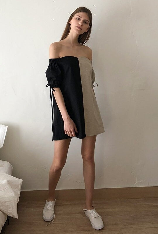 A standout piece with a bold aesthetic, this two-tone off-shoulder linen mini dress by Laura Ren is designed for confident, contemporary style. Crafted from lightweight, breathable linen, the dress features a striking contrast panel construction and a sweetheart neckline that beautifully highlights the shoulders and collarbone. Puff sleeves with adjustable drawstrings and a short hemline deliver a youthful silhouette with volume and ease. Perfect for styling with sneakers for a fresh, urban look or sandals for an elevated summer edit. This dress is the ultimate balance of comfort and cool.