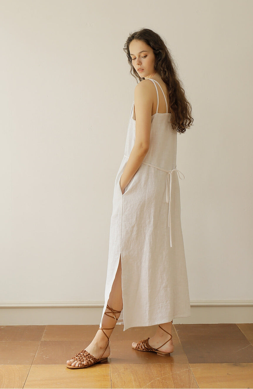 Effortlessly elegant, this white linen maxi dress from Laura Ren is a refined staple for summer wardrobes. Featuring delicate double spaghetti straps and a straight neckline, the design offers a clean, minimal silhouette perfect for warm-weather styling. The dress includes an adjustable waist tie that can be styled to accentuate your shape or left loose for relaxed drape. Crafted from 100% breathable linen, this maxi-length piece flows naturally with every step, making it ideal for beach getaways, garden parties, or resort lounging. Laura Ren merges comfort and sophistication in this versatile piece.
