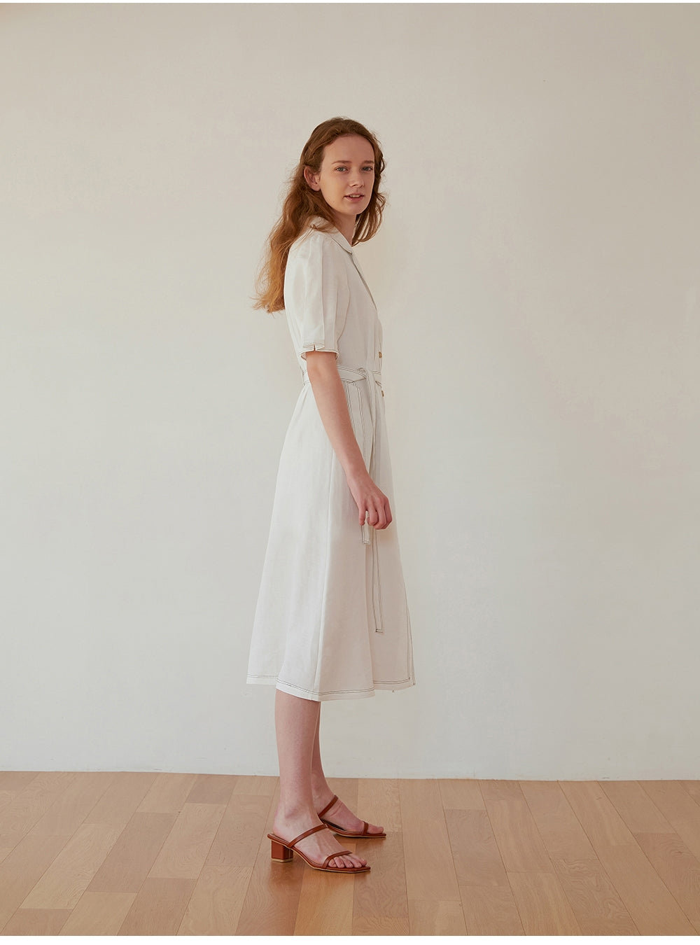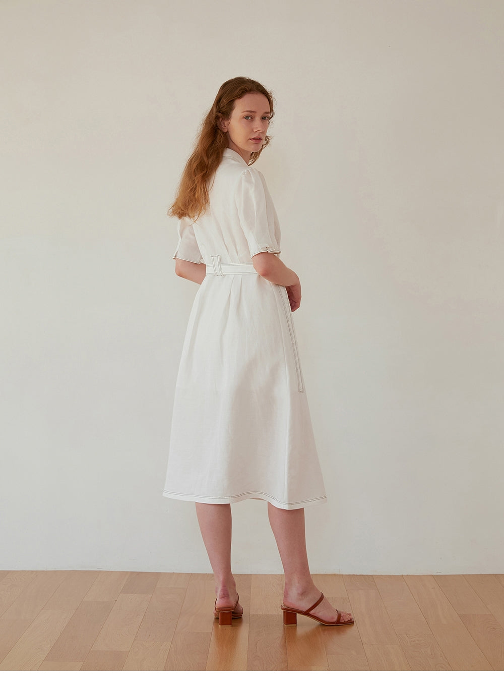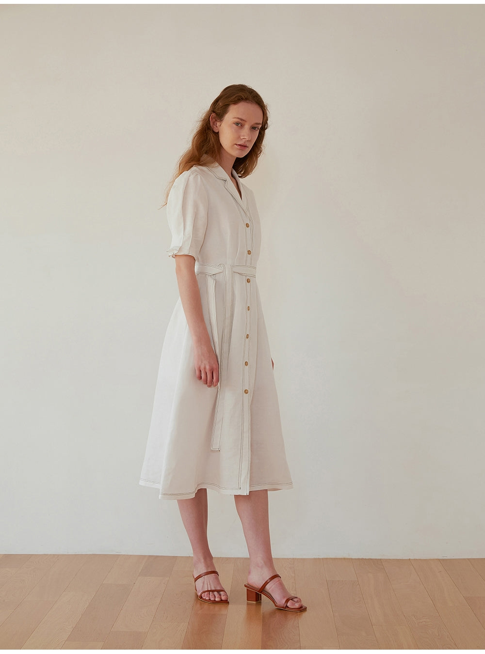 - Linen fabric for lightweight breathability and effortless elegance - Notched collar and contrast stitching add modern, tailored detail - Front button closure and belt define the waist for a feminine silhouette - Short puff sleeves with soft structure and polished finish - Designed by Laura Ren to blend classic design with contemporary refinement