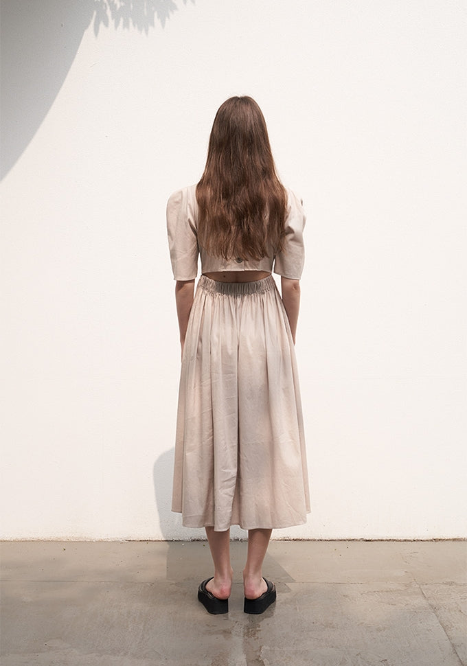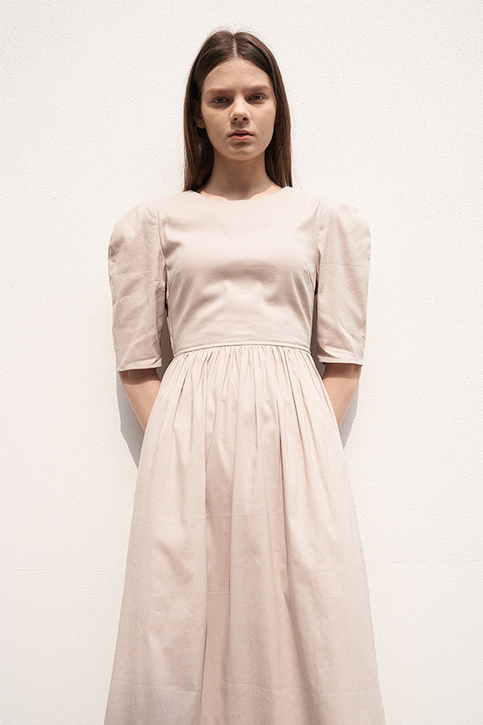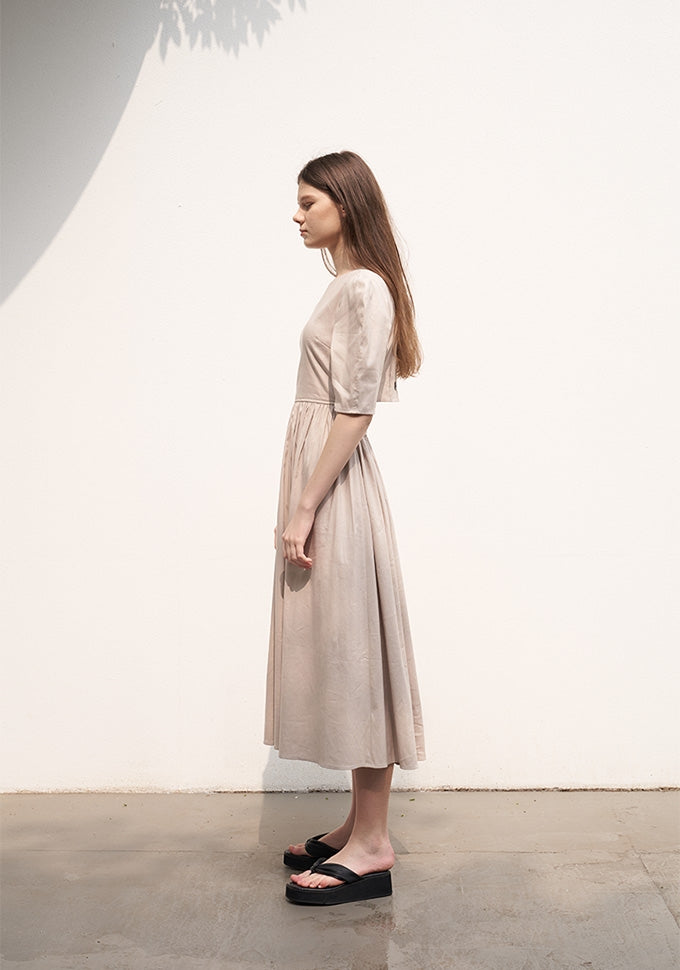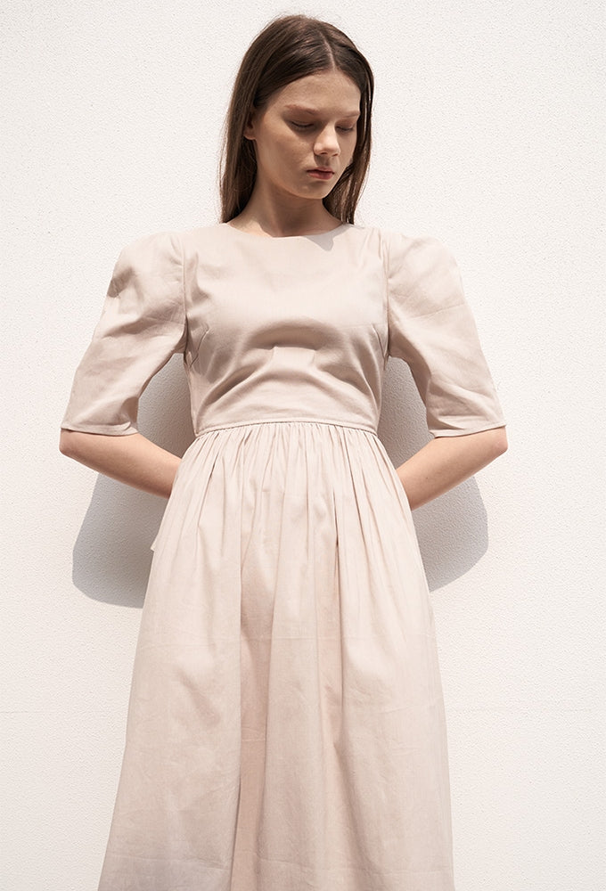 Softly structured and effortlessly feminine, this linen midi dress from Laura Ren blends comfort with elevated style. Crafted from breathable linen, it features a clean round neckline, puffed elbow-length sleeves, and a gathered waist that falls into a flowing A-line skirt. The back elastic detail ensures a flexible fit while enhancing the silhouette. Lightweight and versatile, this dress is perfect for warm weather occasions, weekend wear, or travel. Its natural fabric and soft drape give it timeless appeal, making it a wardrobe essential for those who value refined ease and breathable luxury.