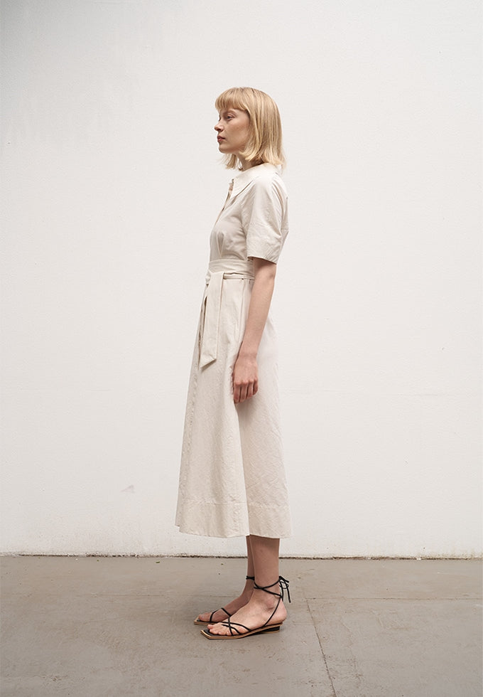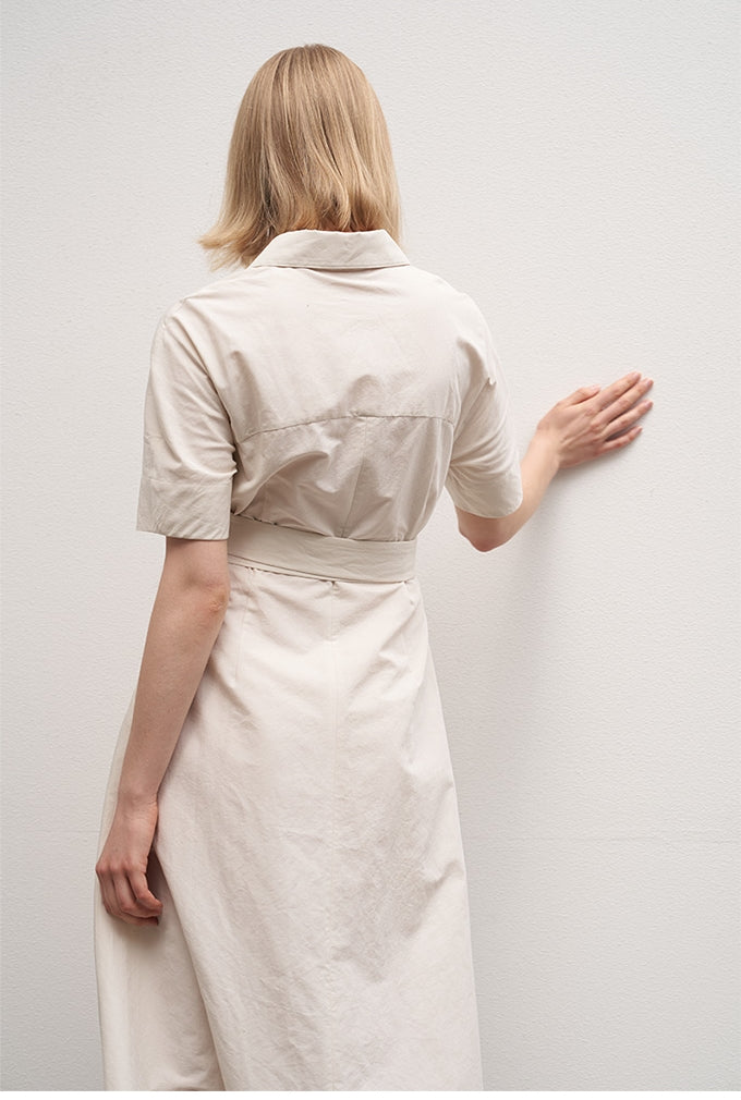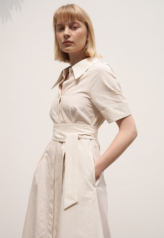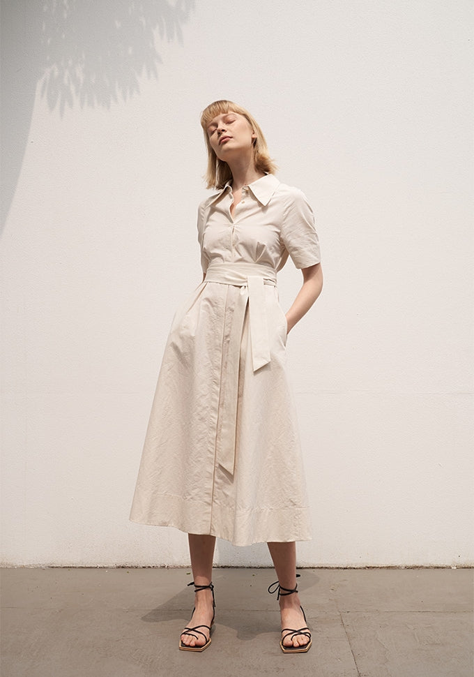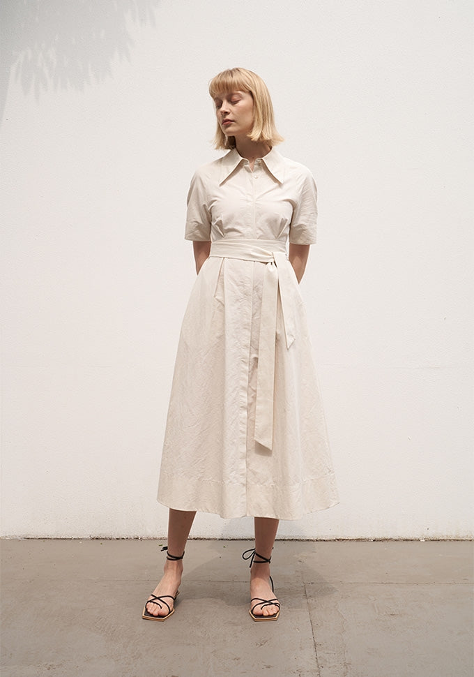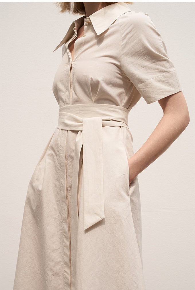 This elegant linen shirt dress from Laura Ren brings timeless tailoring to warm-weather dressing. Crafted from breathable linen, it features a sharp collared neckline, short sleeves, and a full A-line skirt for flattering structure. The self-tie belt cinches the waist for a defined silhouette, while discreet side pockets add practicality. Designed to transition seamlessly from workdays to weekend escapes, the midi length and natural texture offer both sophistication and comfort. Lightweight, polished, and effortlessly versatile—this dress is a refined essential for modern wardrobes.