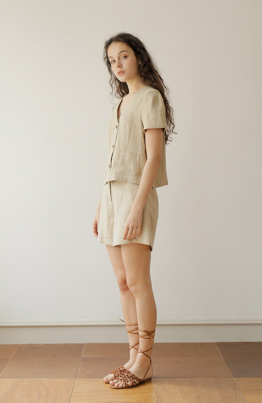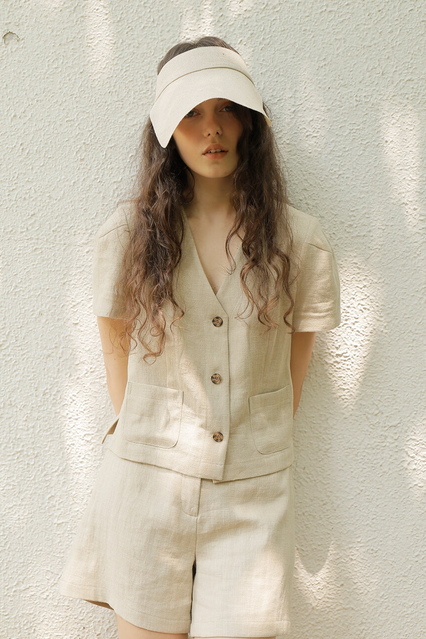 The linen blouse from Laura Ren is a modern take on effortless elegance, crafted from breathable linen that’s perfect for warm-weather dressing. This short-sleeve blouse features a flattering V-neck with a notched collar, a structured silhouette, and button-down front that adds timeless charm to your wardrobe. The lightweight linen fabric ensures all-day comfort while keeping your look polished. Pair it with tailored shorts or denim for a refined yet relaxed ensemble. Ideal for casual days, brunches, or travel, this top offers versatility and natural sophistication in one chic package.