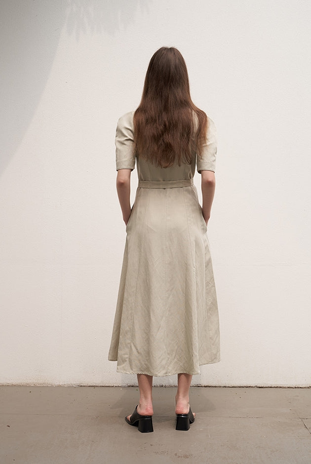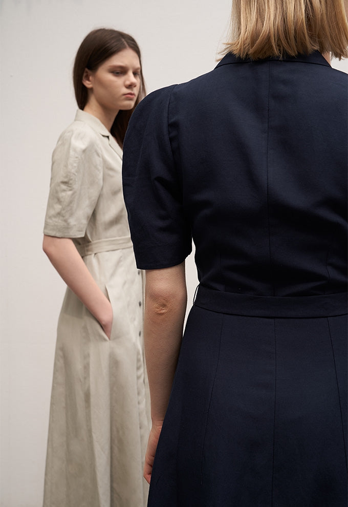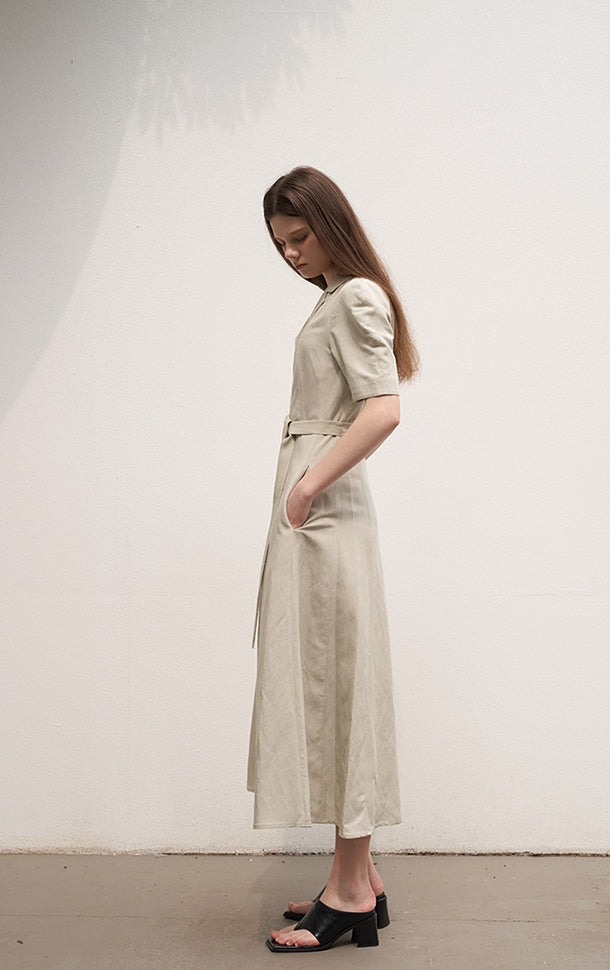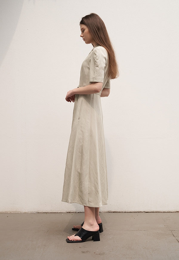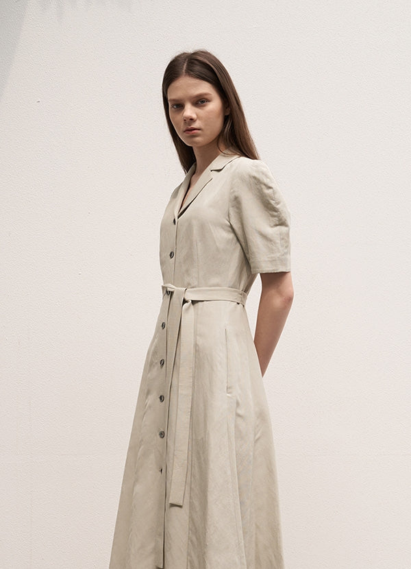 Chic and timeless, this short sleeve linen midi dress from Laura Ren is designed for effortless elegance. Crafted from breathable 100% linen, it features a sharp notched collar, a full button-down front, and a self-tie belt to softly define the waist. The structured short sleeves add a modern edge, while the flared midi silhouette ensures graceful movement. Ideal for summer days, city outings, or vacation dressing, this versatile linen dress balances classic tailoring with relaxed comfort. A must-have staple that brings polish to every wardrobe with the ease of natural fiber.