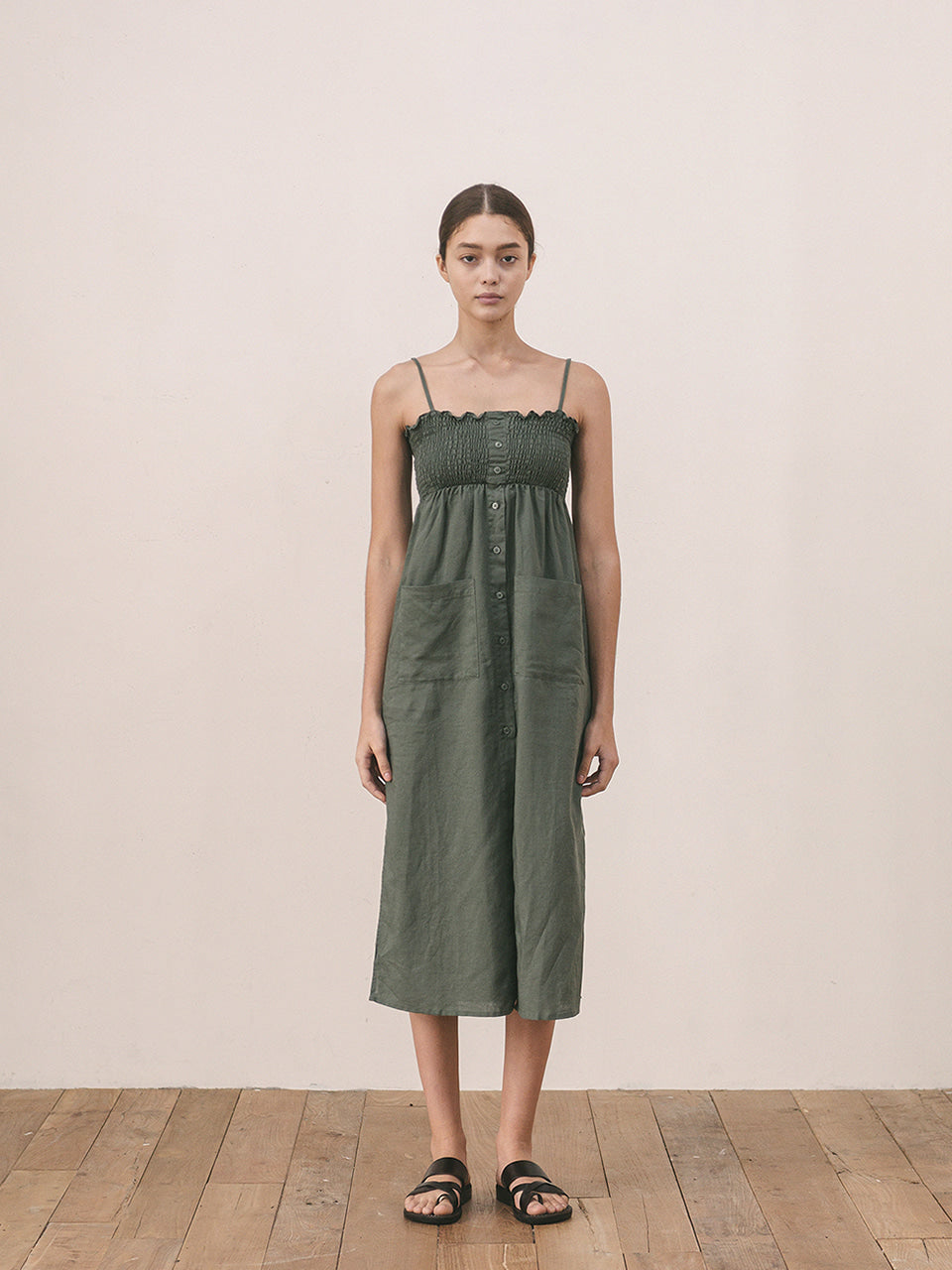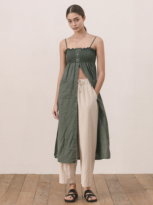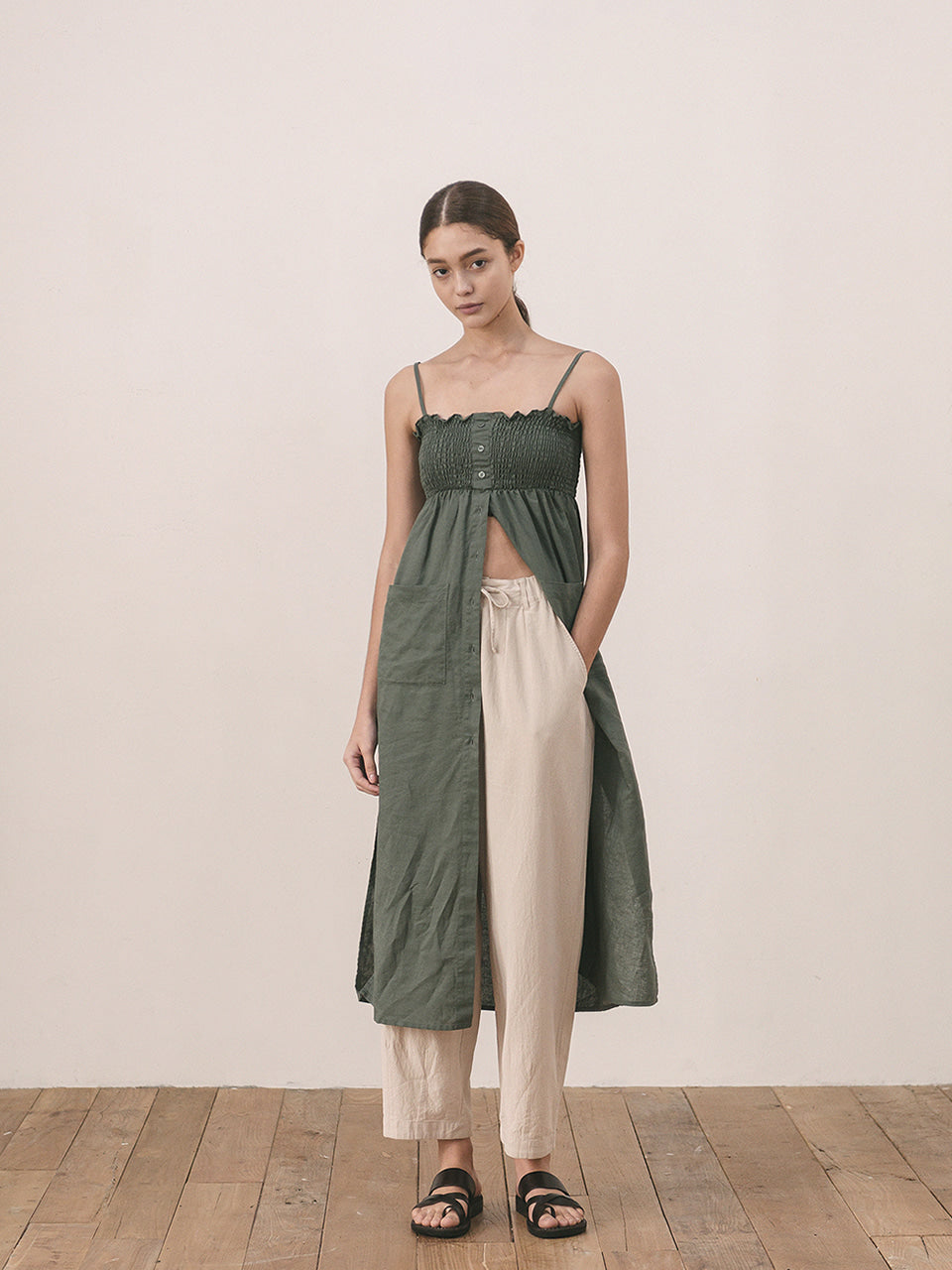 Refresh your warm-weather wardrobe with this smocked linen midi dress from Laura Ren, combining elevated comfort with versatile style. Crafted from breathable linen, this dress features a flattering smocked bodice, adjustable spaghetti straps, and a functional button-down front that allows you to wear it as a dress or open as a layering piece. Deep front patch pockets add utility to the relaxed silhouette, while side slits offer freedom of movement. Perfect for summer outings or effortless layering over pants, this linen dress is a timeless essential for modern, minimalist dressing.